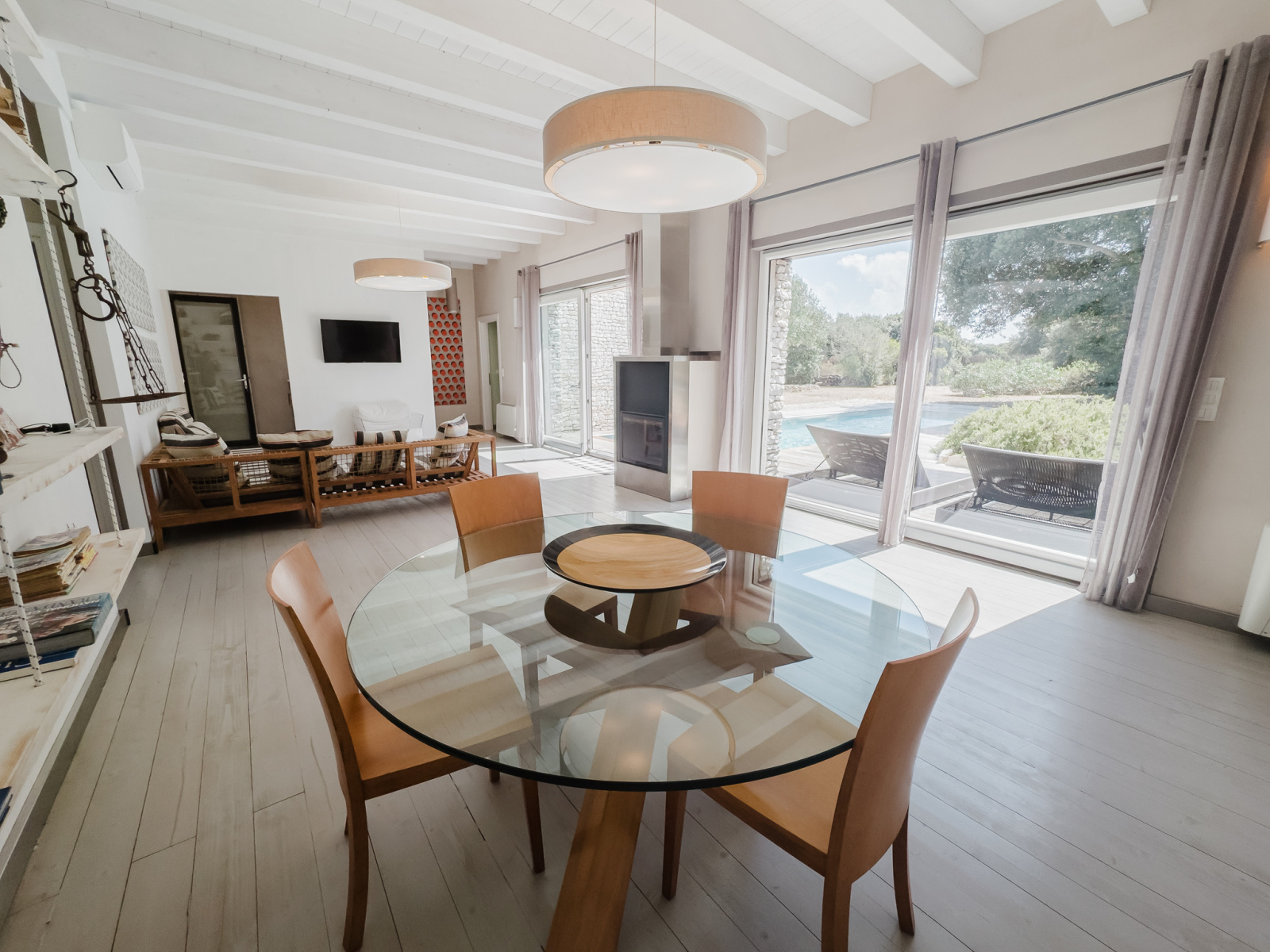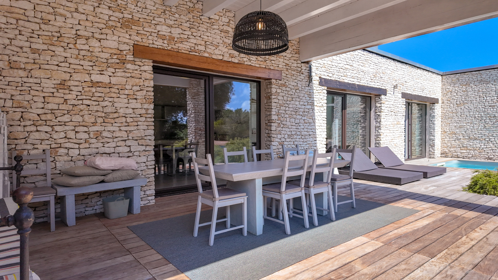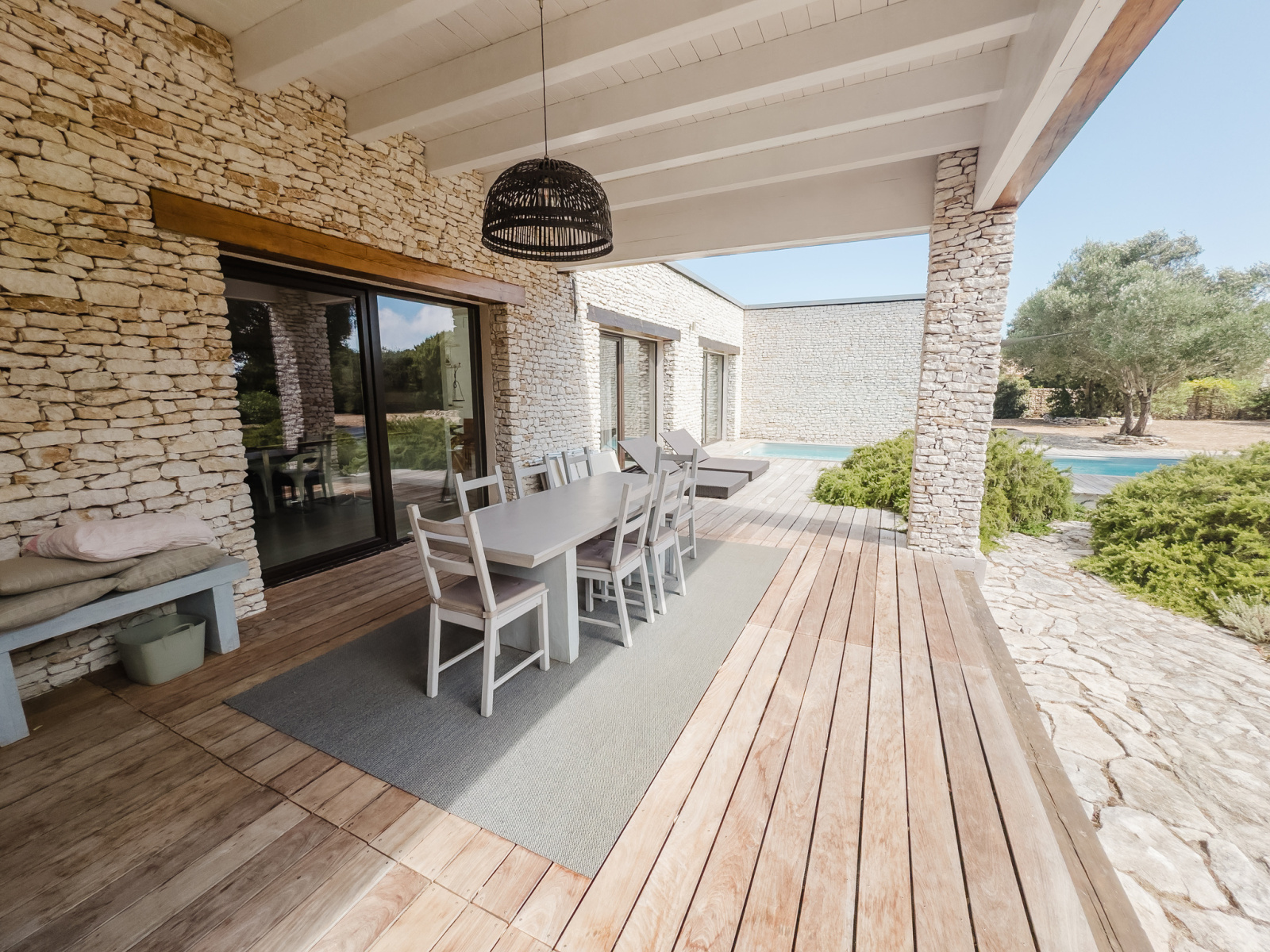Bonifacio (20169)Cette belle villa à l'allure bohème-chic ne vous laissera pas indifférent. Recouverte de pierres de Bonifacio, son intérieur en bois clair offre de vaste volumes, tous donnant sur l'extérieur. Cette villa contemporaine de 150m2 habitables environ se prolonge sur une terrasse couverte de 30m2 où se dérouleront vos plus belles soirées d'été, à côté de la piscine.