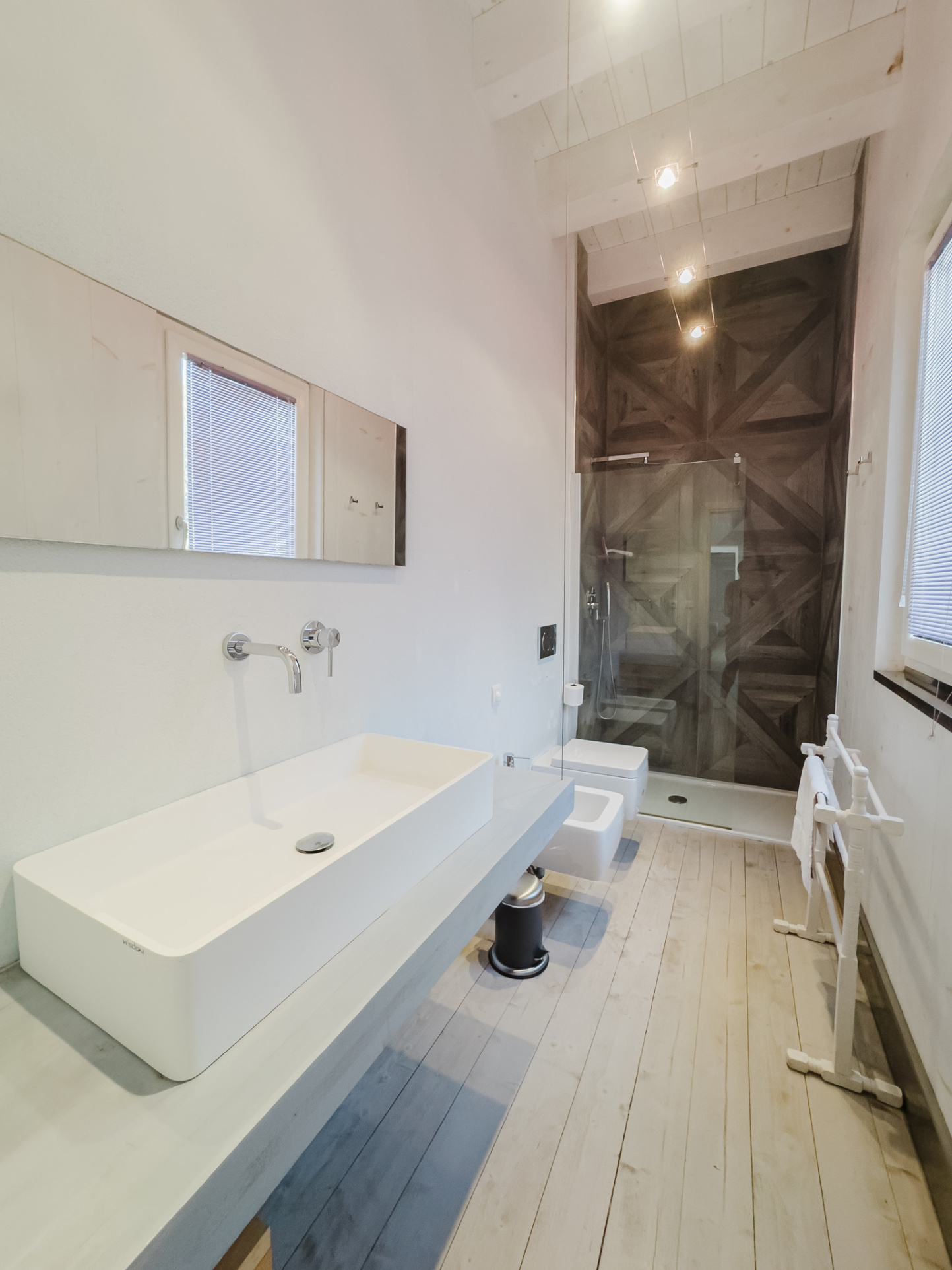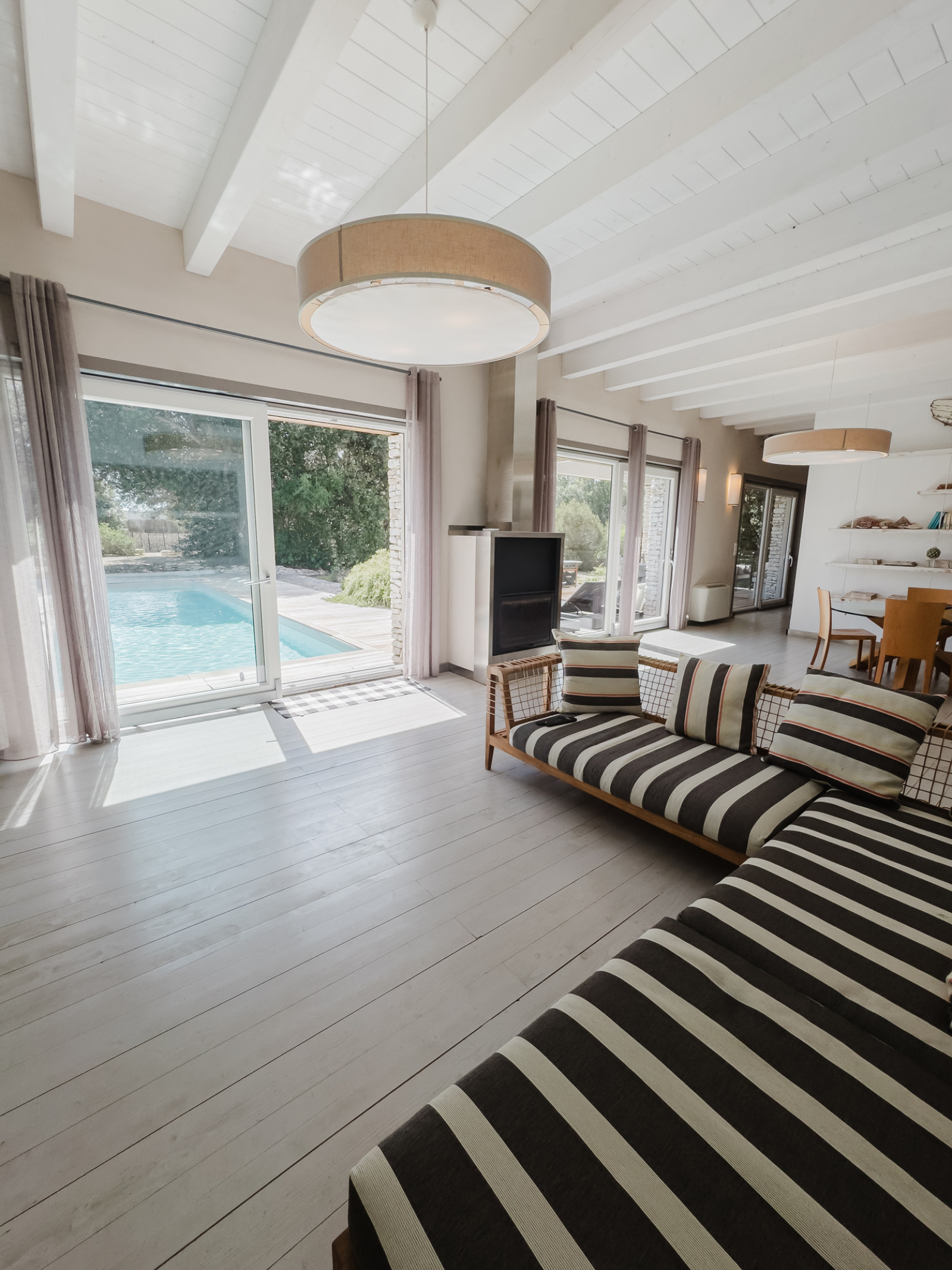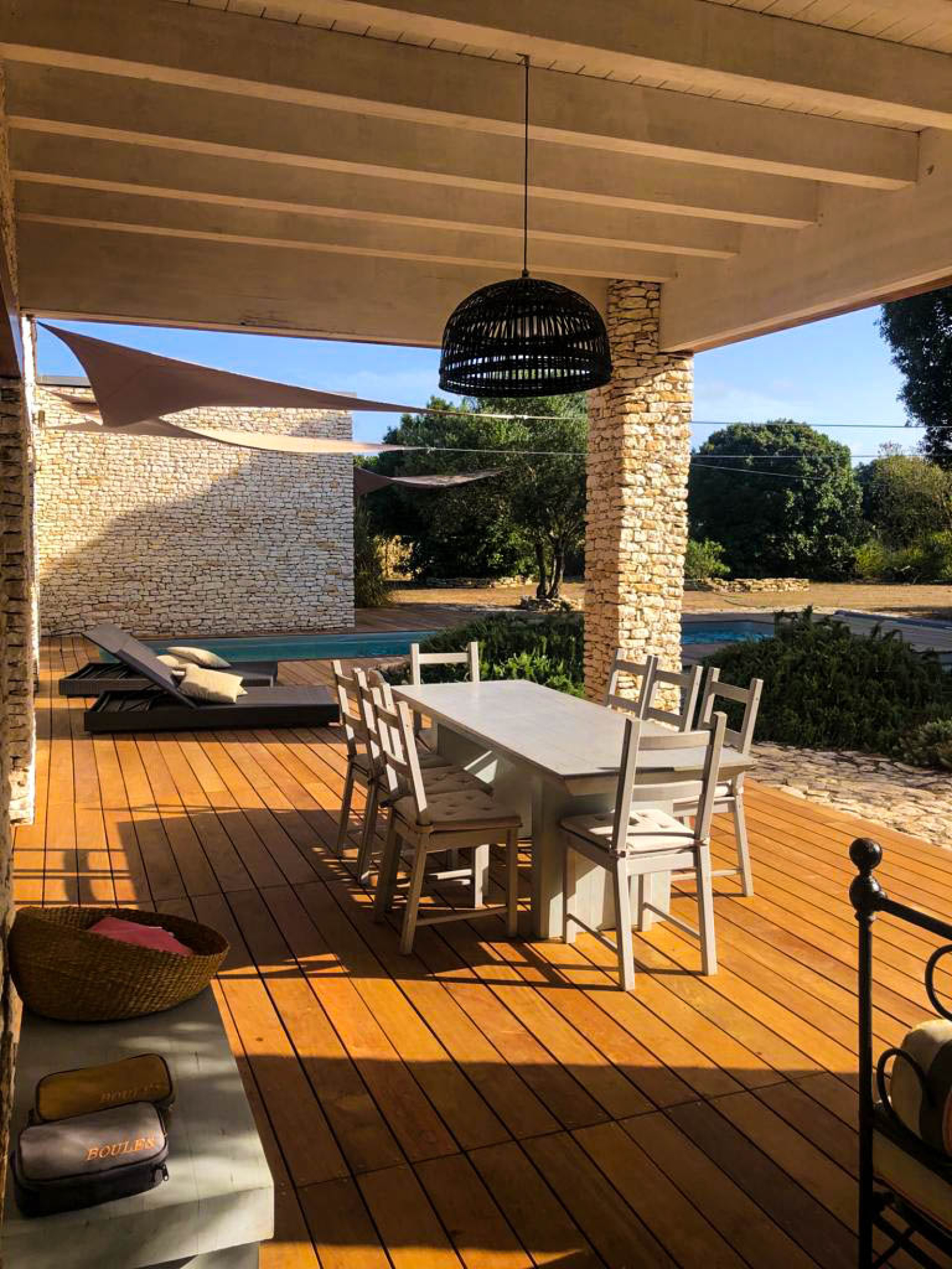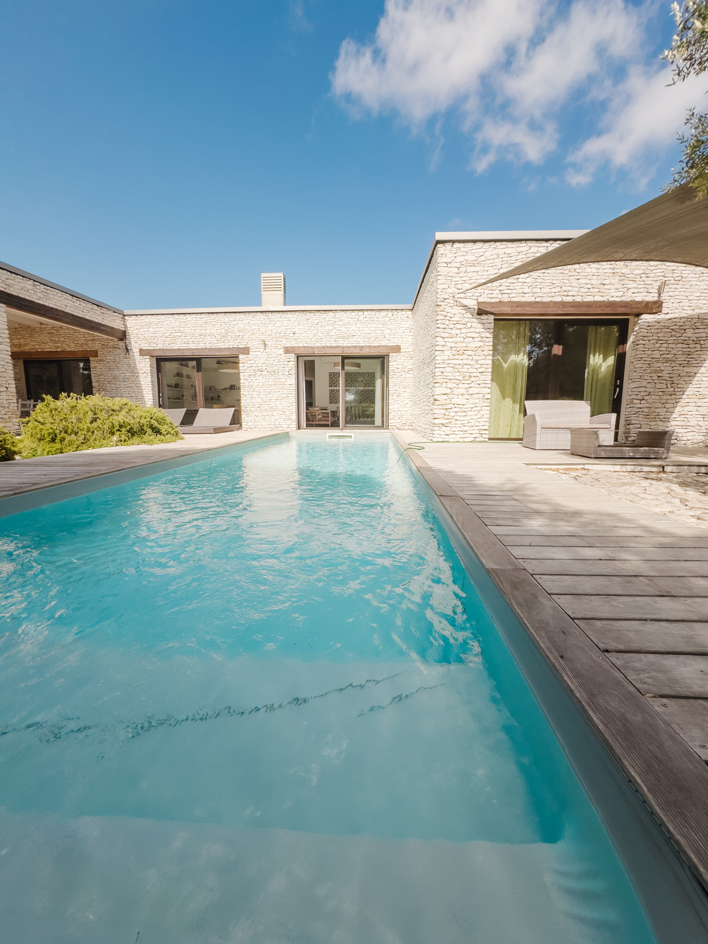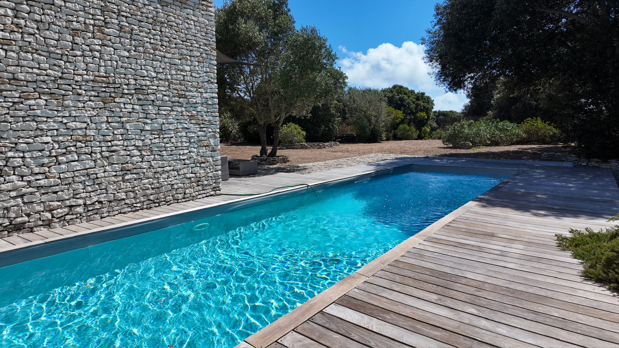 Sa piscine de 3x11m est entourée d'une terrasse bois où sont installés des bains de soleil pour profiter de moments de détente.