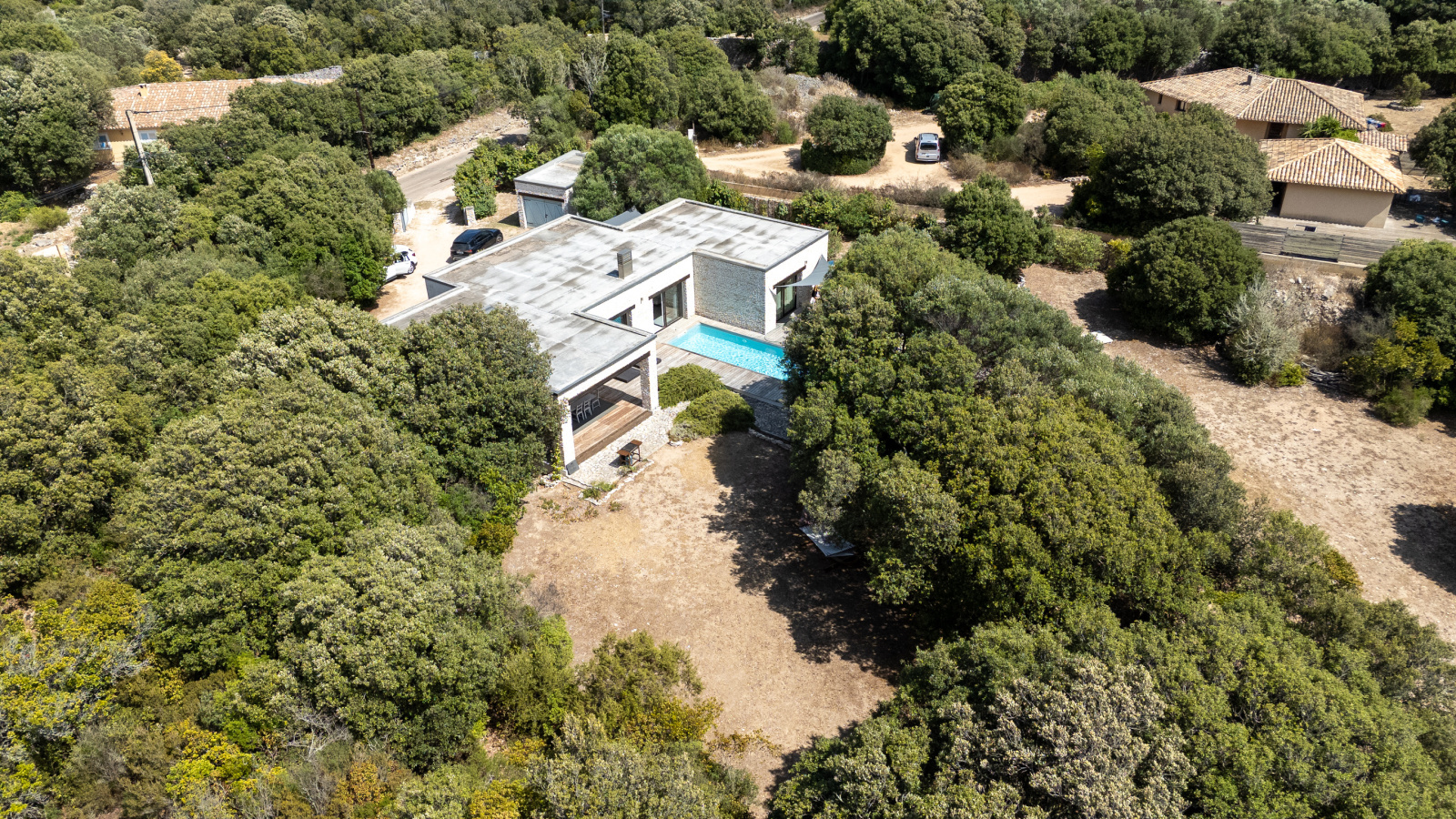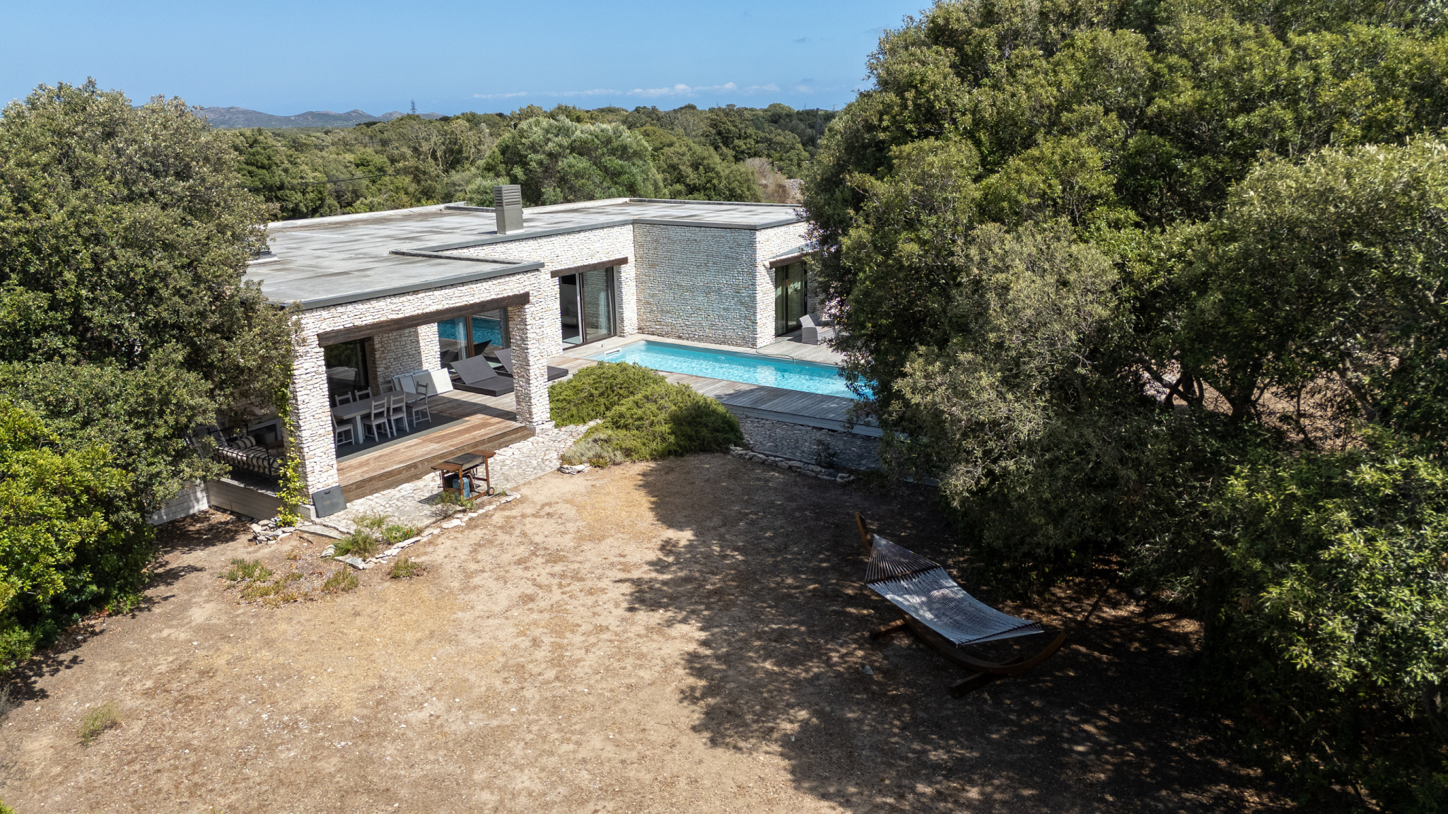 Edifiée sur un terrain arboré d'essences endémiques (oliviers, chênes verts) de 3 000m2 clos par un mur en pierres, sans aucun vis-à-vis, vous bénéficierez d'un emplacement stratégique, à 5 min des plages de Maora et Sant'Amanza, 5 min du port de Bonifacio, 5 min des commodités, 3 min d'une boulangerie, tout en étant au calme. On rejoint Porto-Vecchio et l'aéroport de Figari en 20 min.
