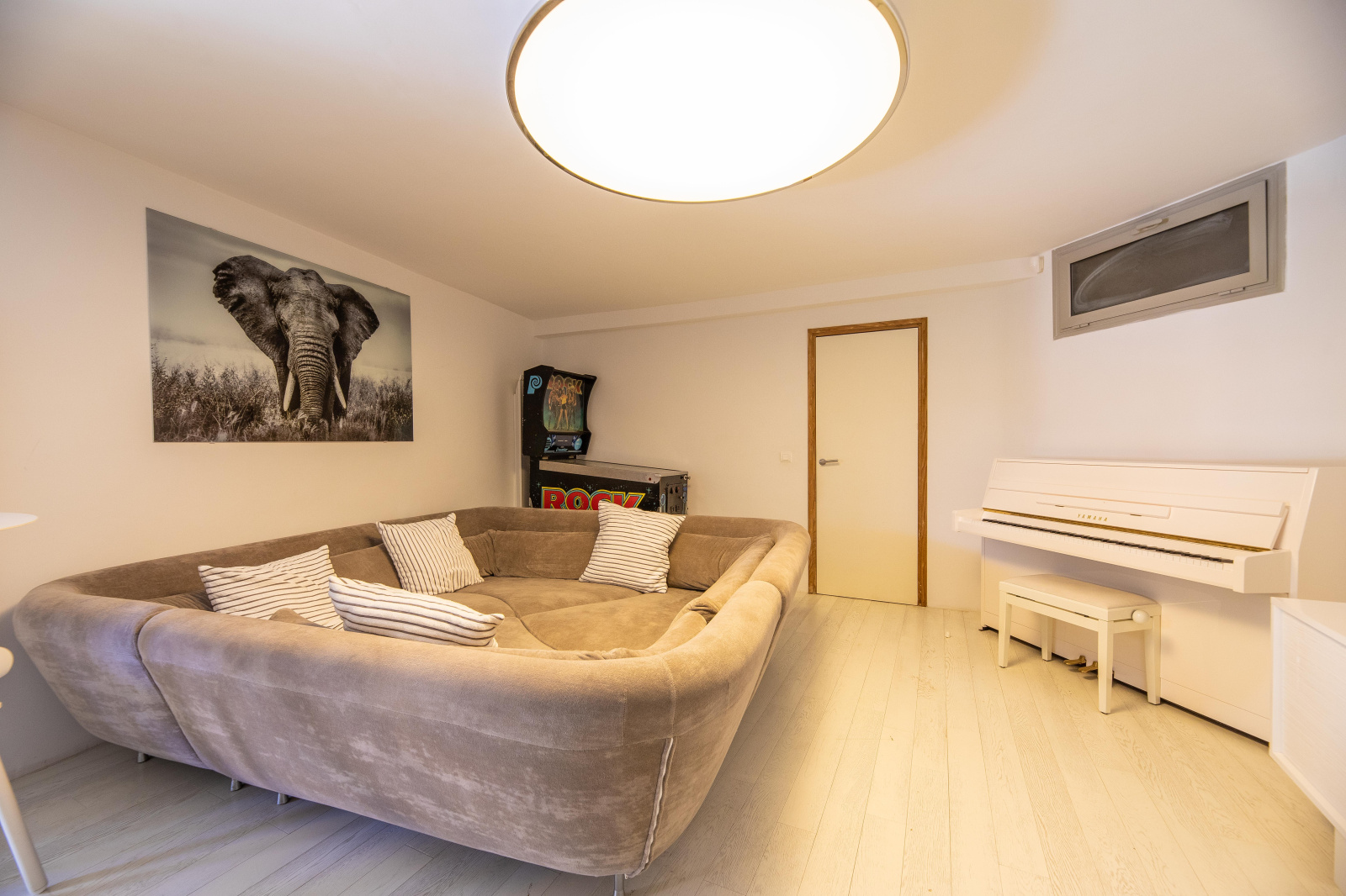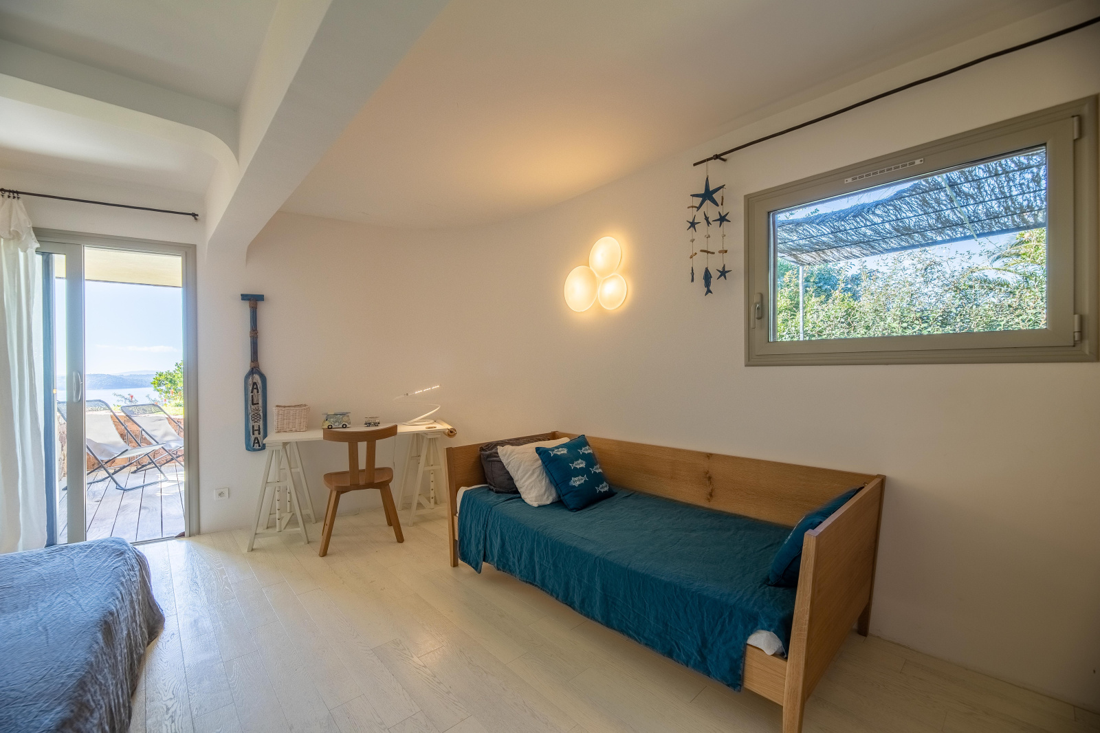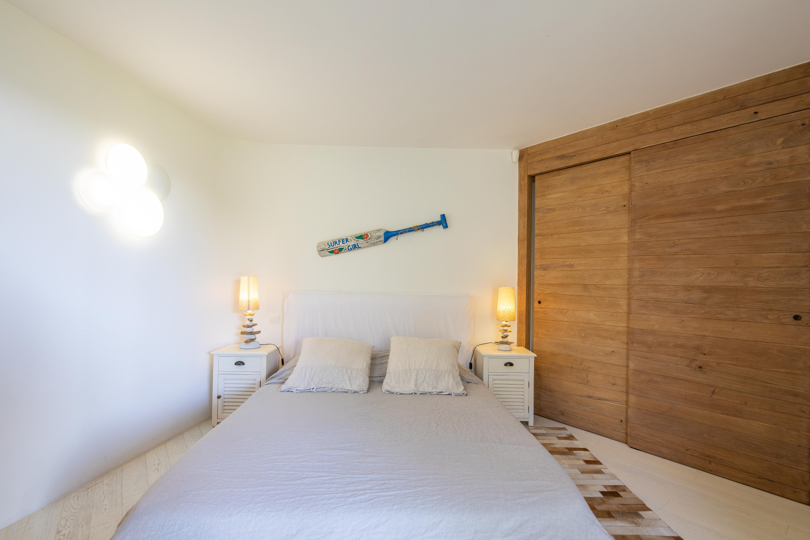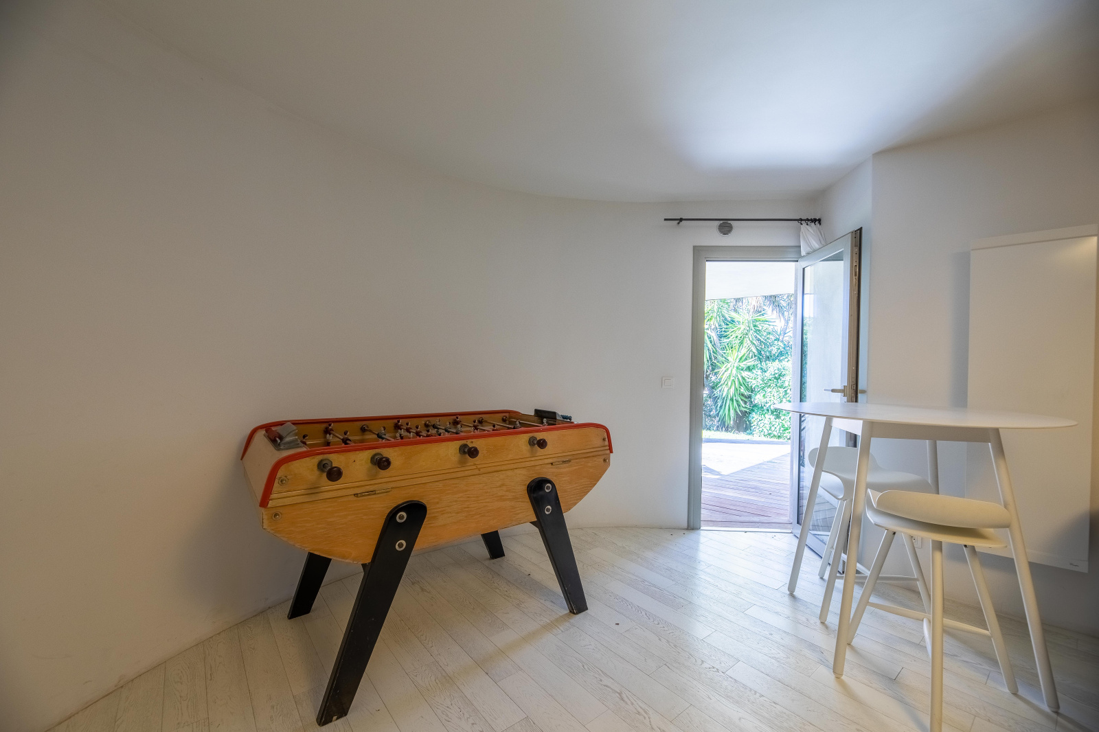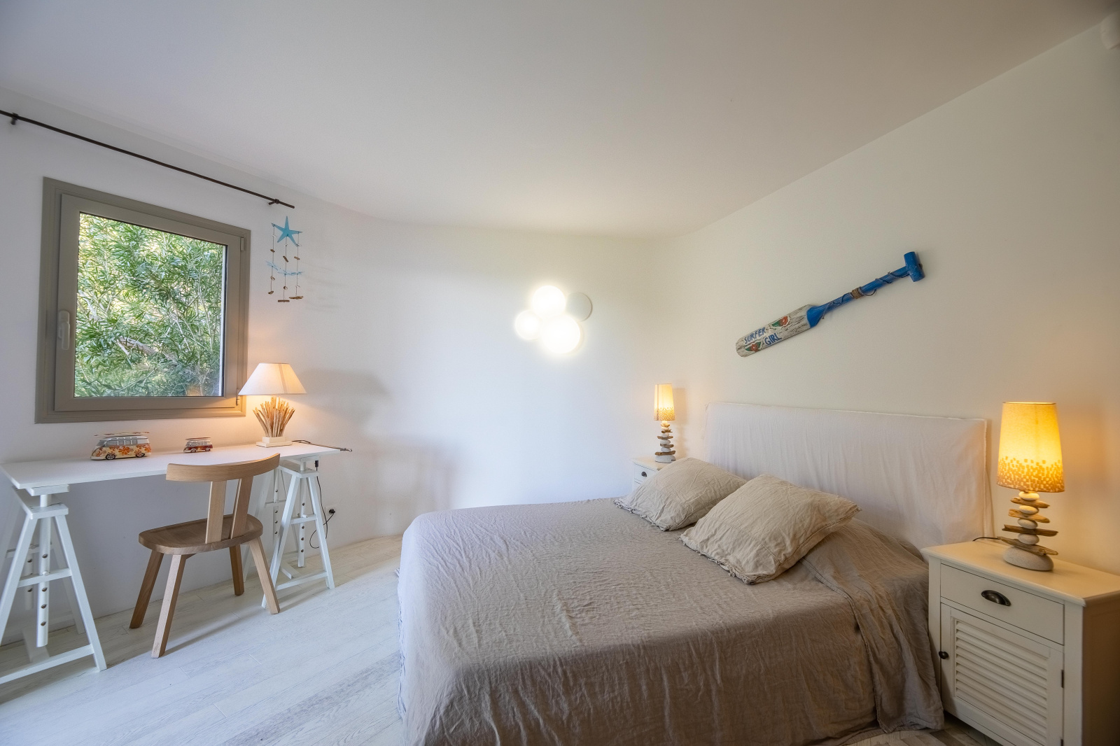 La villa s’ouvre sur une entrée desservant d’un côté un bureau, la buanderie et une salle de jeux qui satisfera les petits et les grands enfants : un piano, une TV avec jeux vidéo et un baby foot. De l’autre, un espace nuit composé de 2 chambres doubles avec placards, une salle d'eau et un WC.
