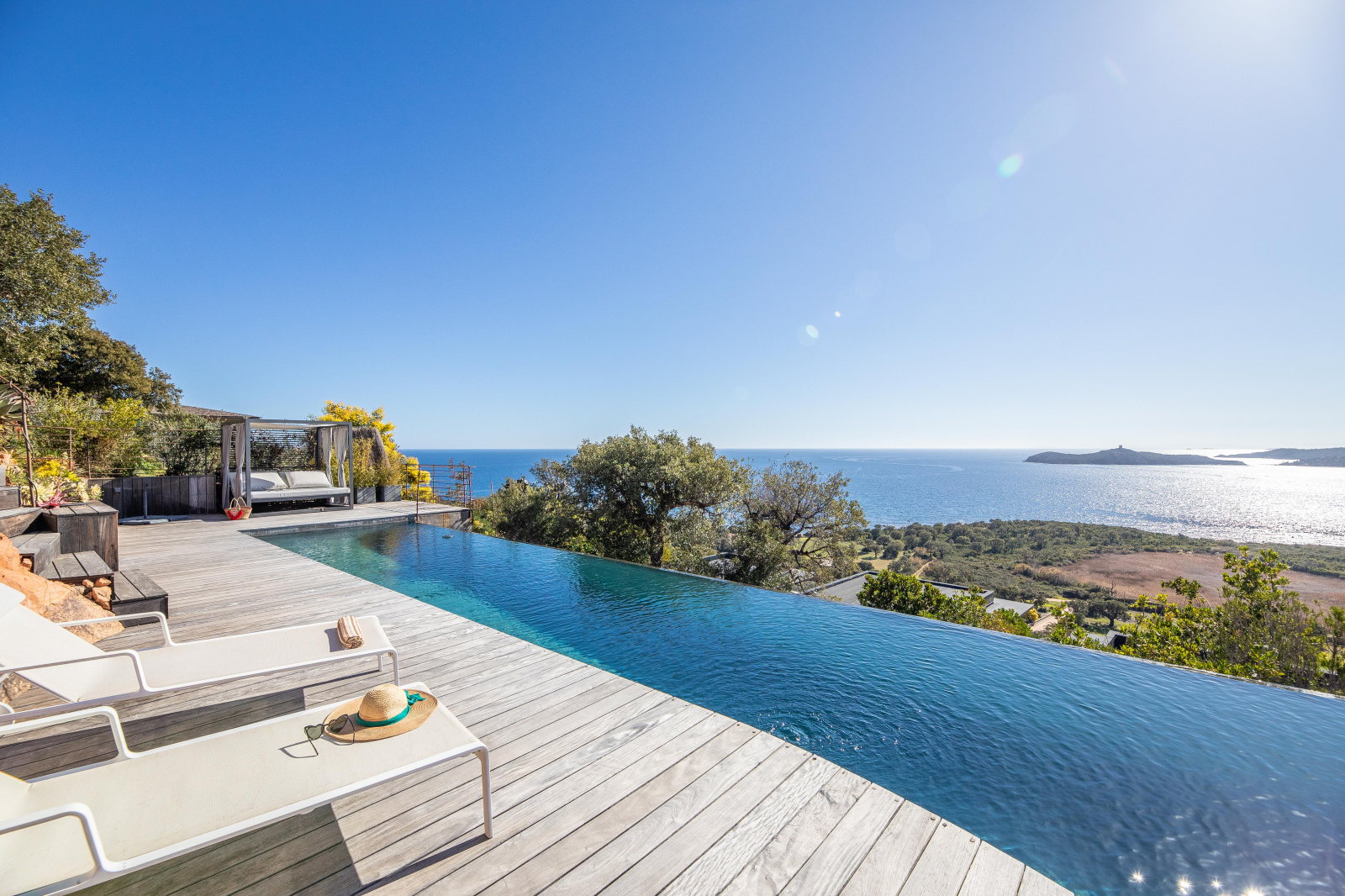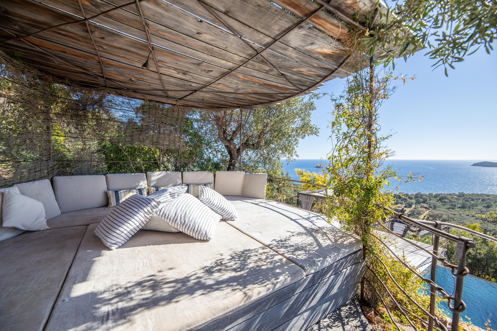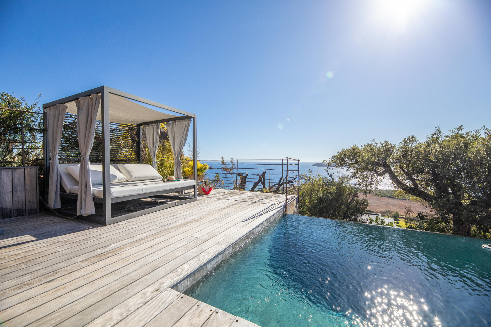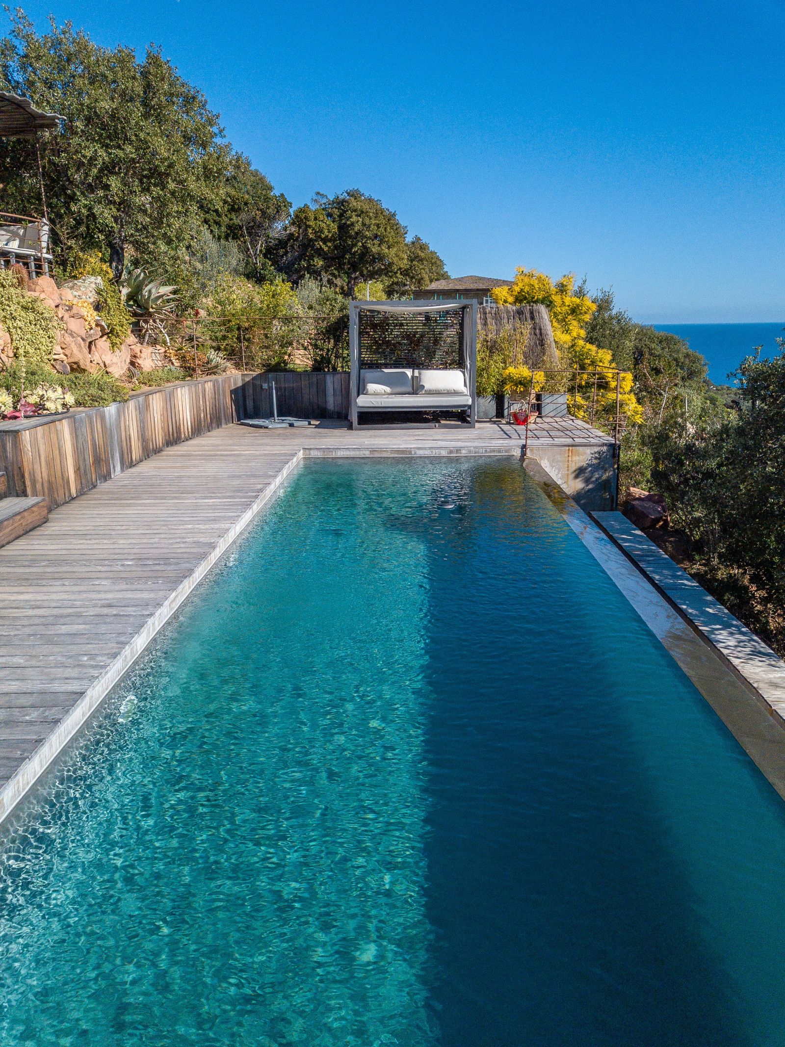 La piscine est située en contrebas du jardin. A débordement, elle offre une époustouflante vue mer et sa terrasse bois un espace de repos et de farniente. Un bain de soleil double posé sous une tonnelle ainsi qu’un espace ombragé niché dans les arbres invitent à la paresse.
