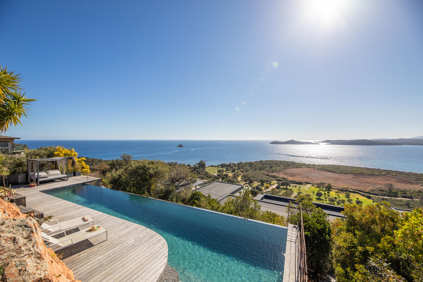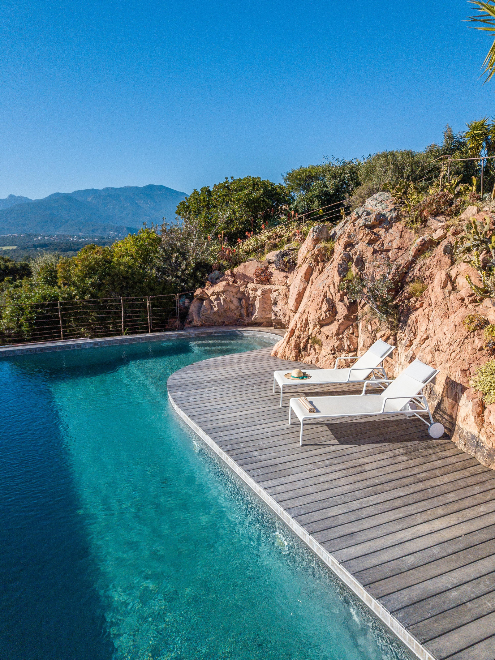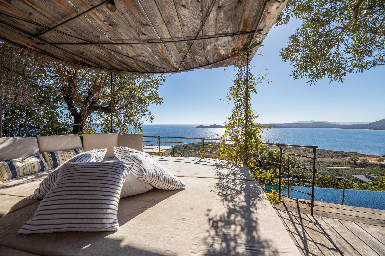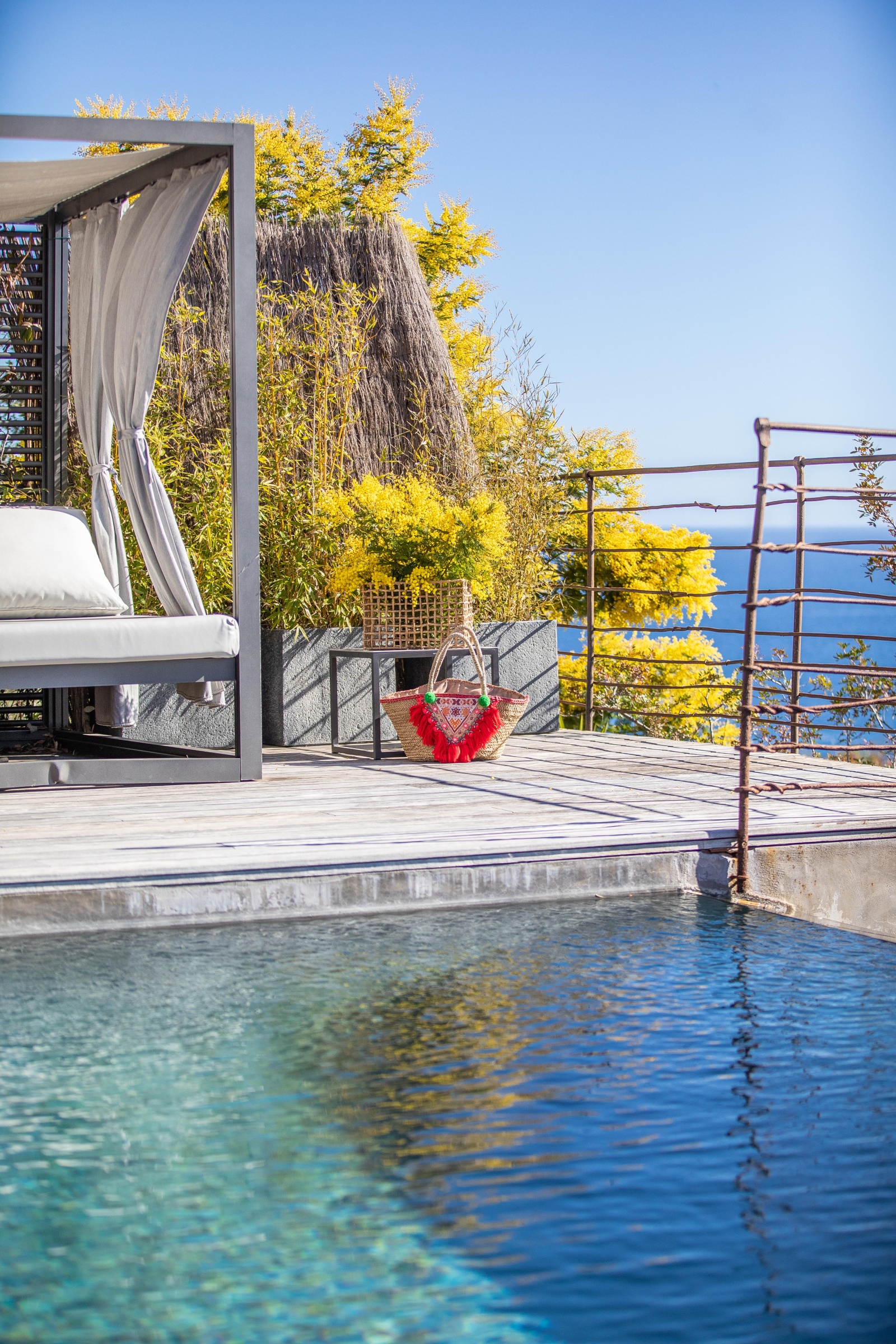 La piscine est située en contrebas du jardin. A débordement, elle offre une époustouflante vue mer et sa terrasse bois un espace de repos et de farniente. Un bain de soleil double posé sous une tonnelle ainsi qu’un espace ombragé niché dans les arbres invitent à la paresse.