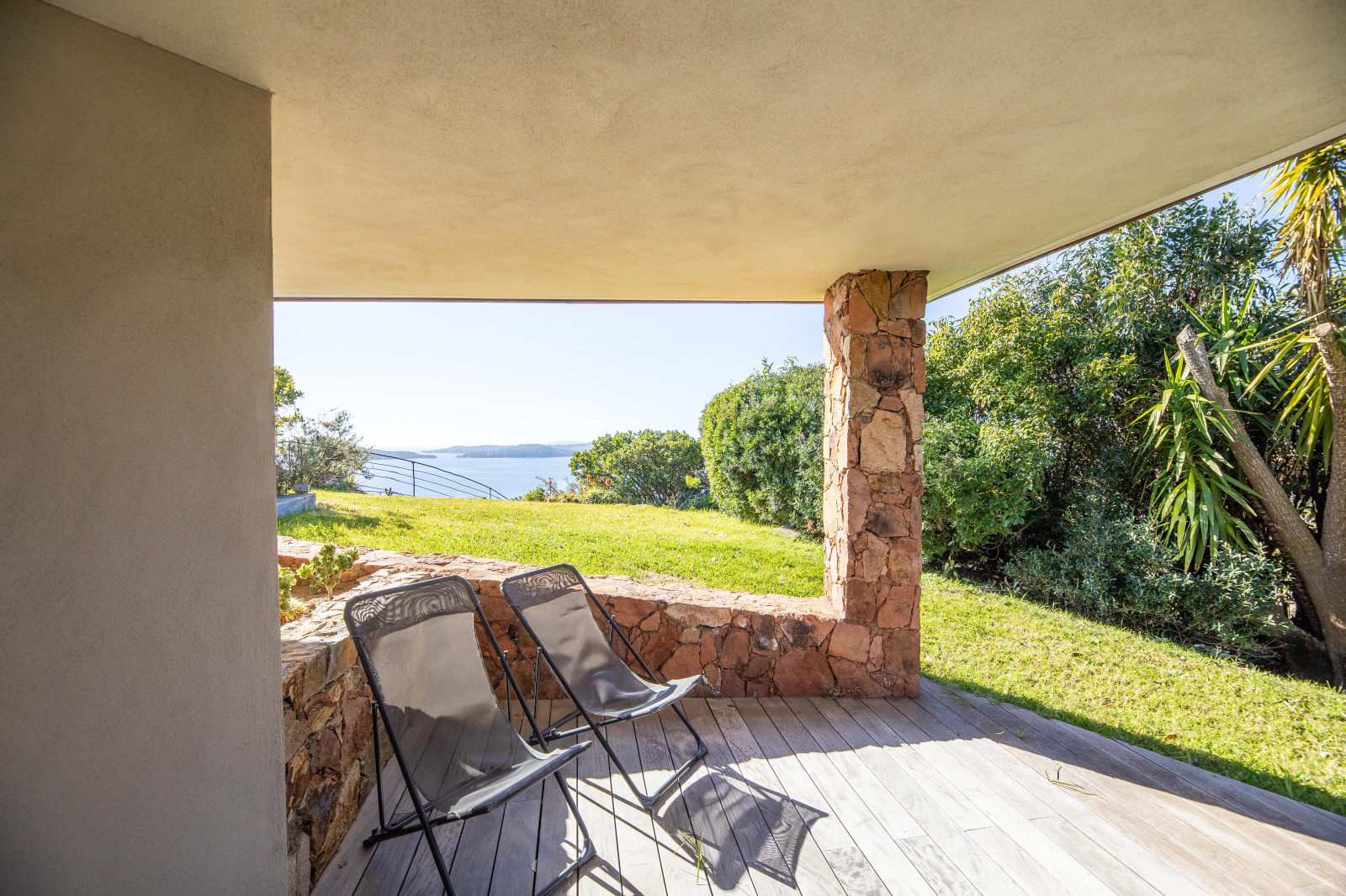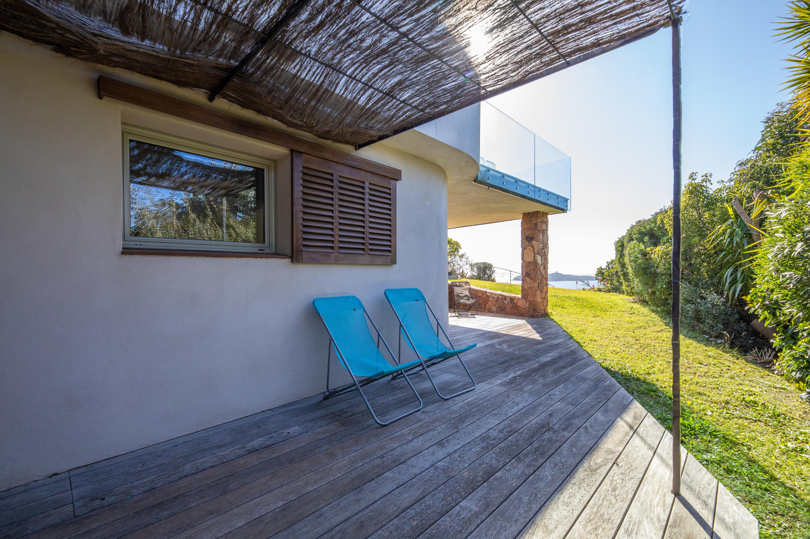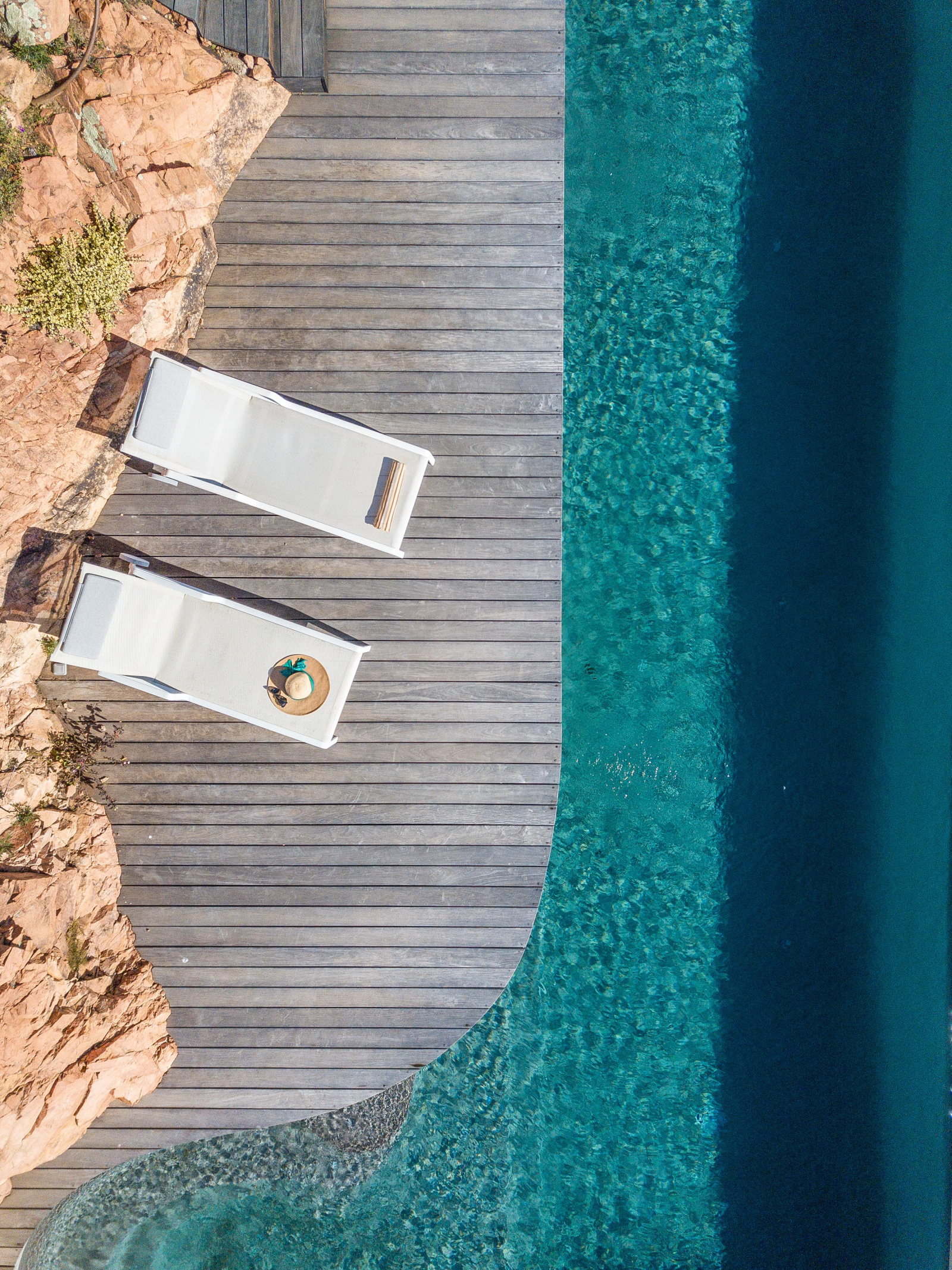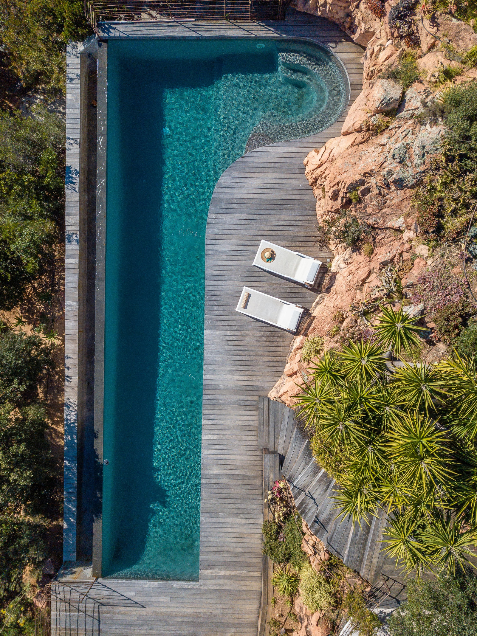 La piscine est située en contrebas du jardin. A débordement, elle offre une époustouflante vue mer et sa terrasse bois un espace de repos et de farniente. Un bain de soleil double posé sous une tonnelle ainsi qu’un espace ombragé niché dans les arbres invitent à la paresse.