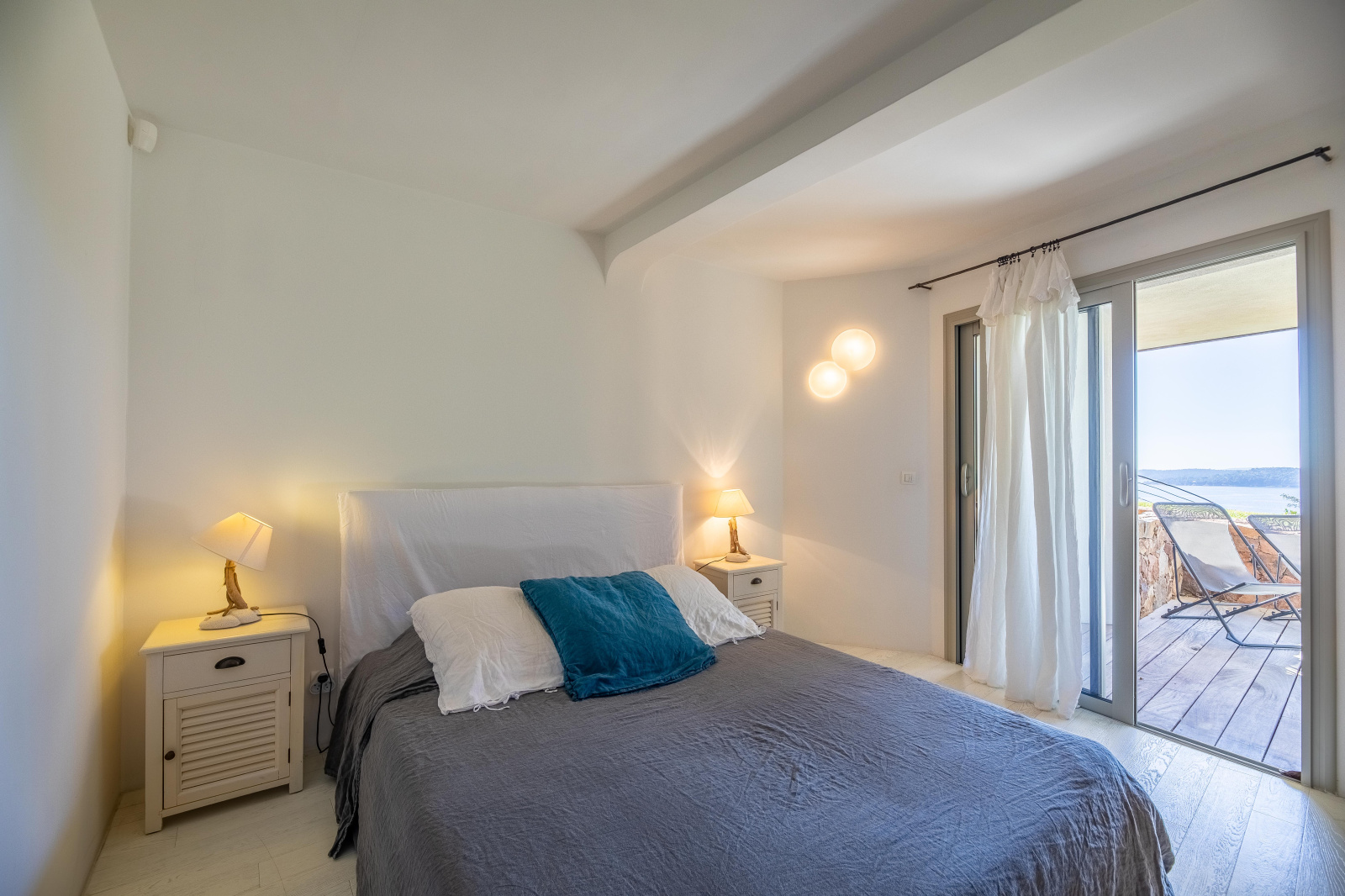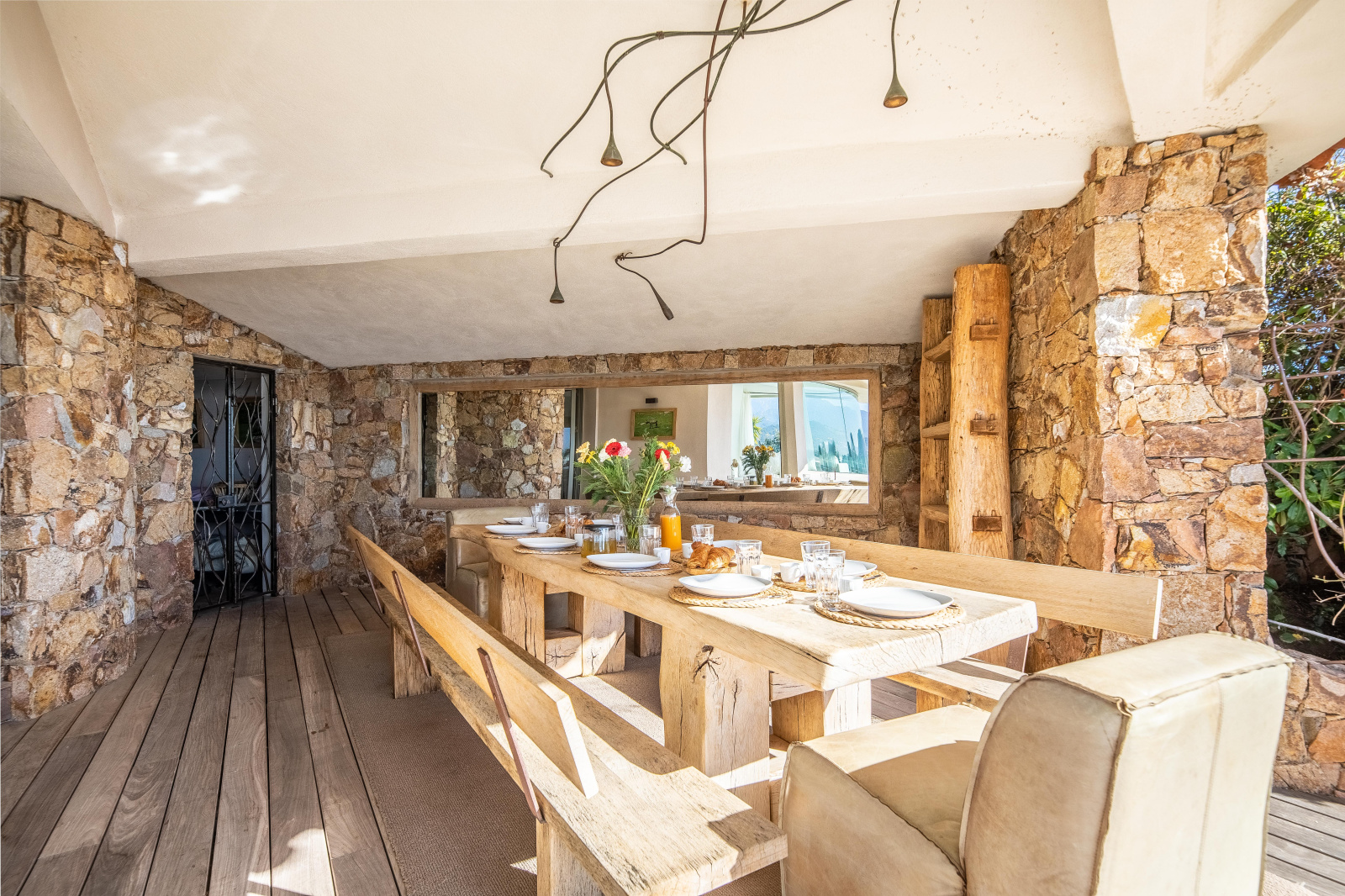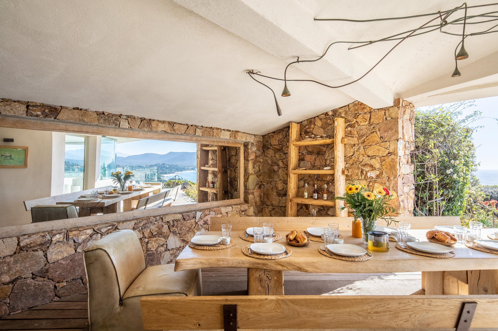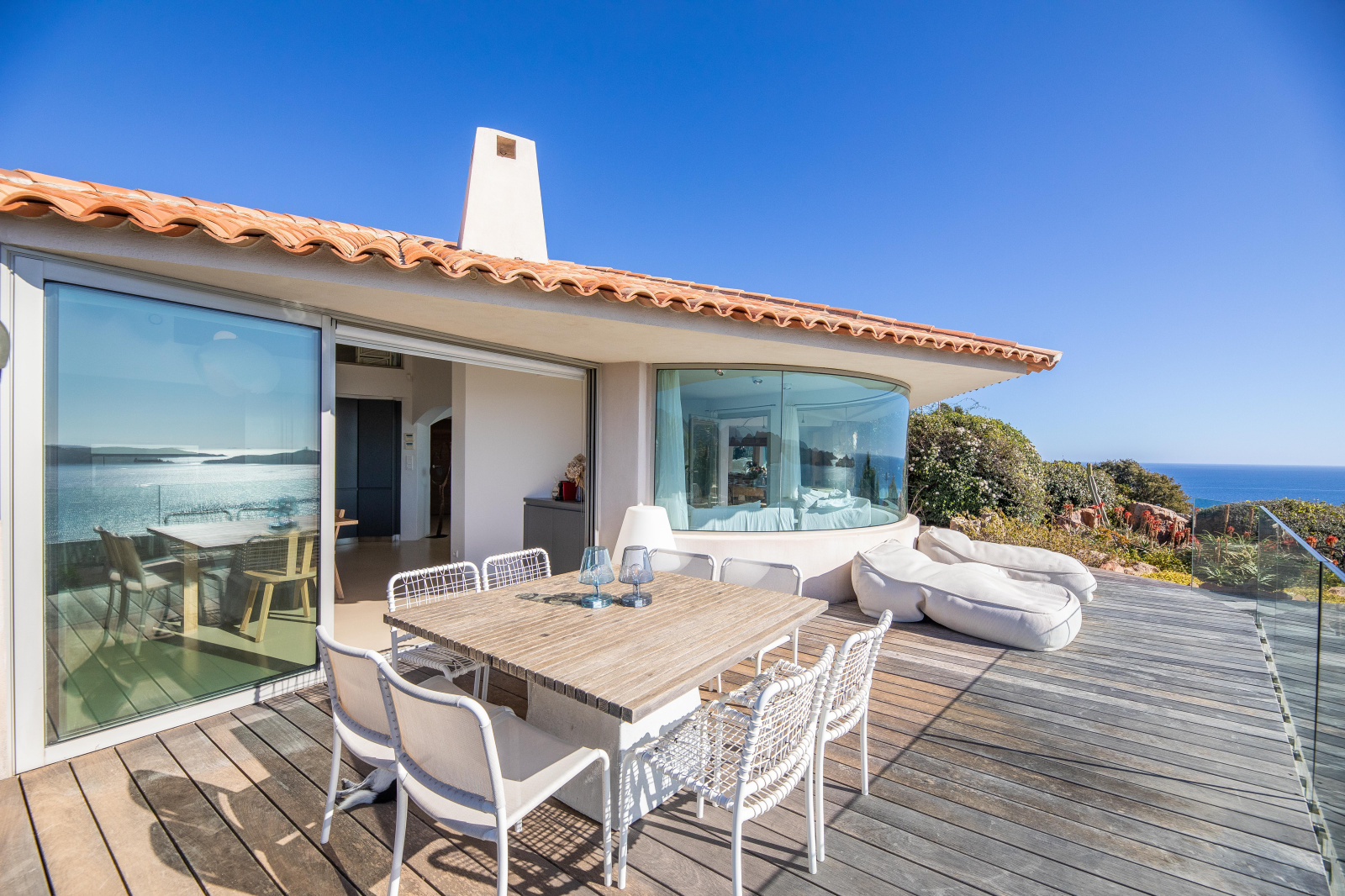 Du salon on accède à la terrasse couverte où trône une table en bois, face à un large miroir qui reflète la mer. Une cuisine d’extérieur avec frigo, évier, barbecue et plancha est idéale pour les repas estivaux.