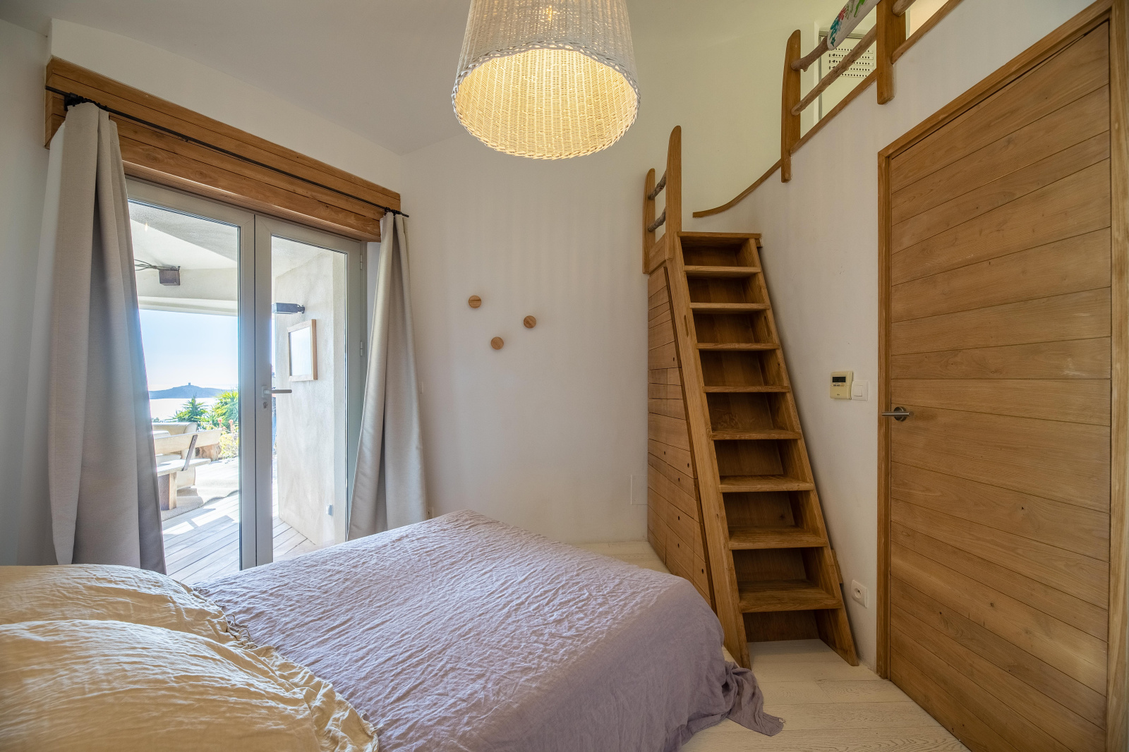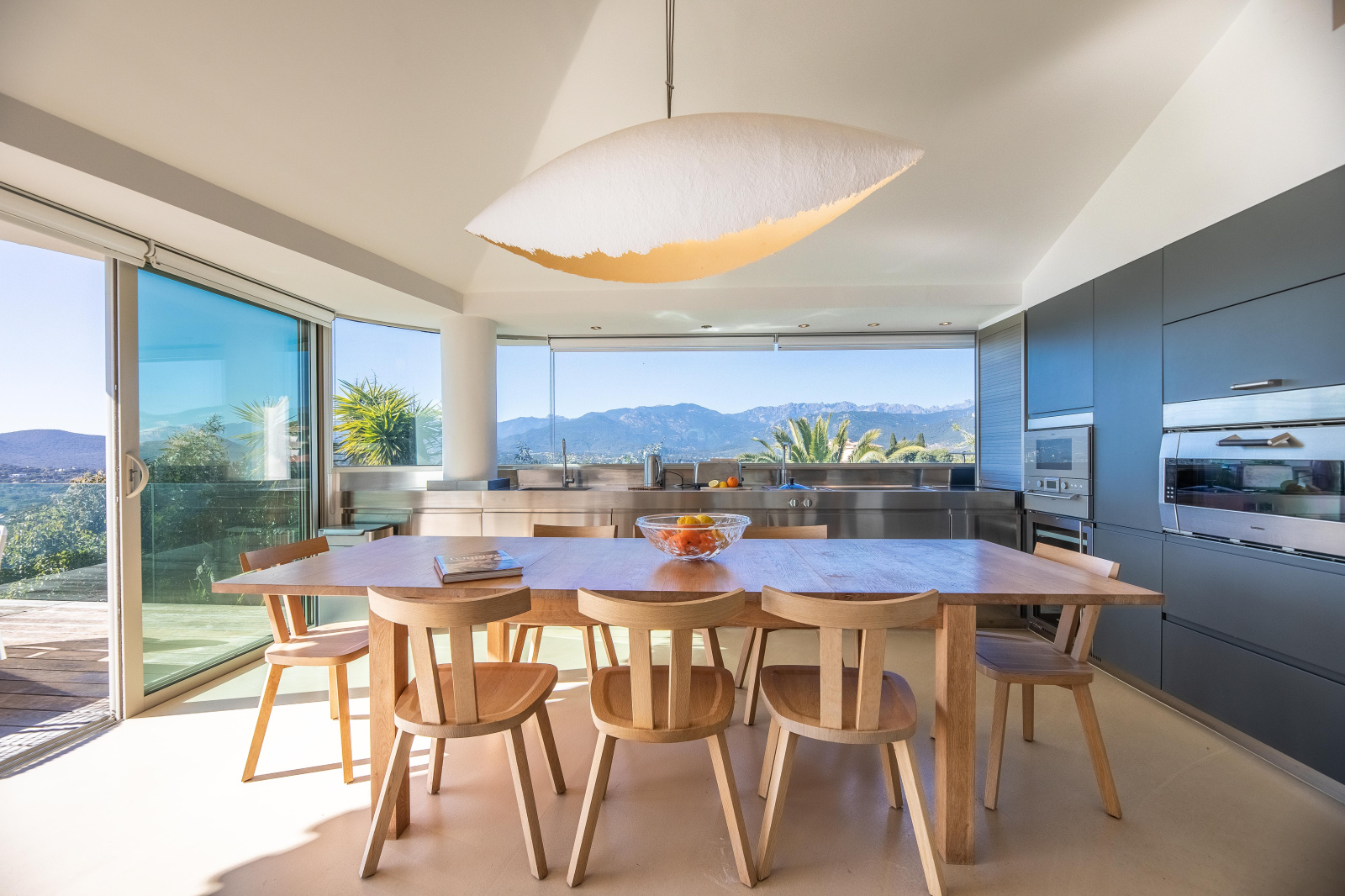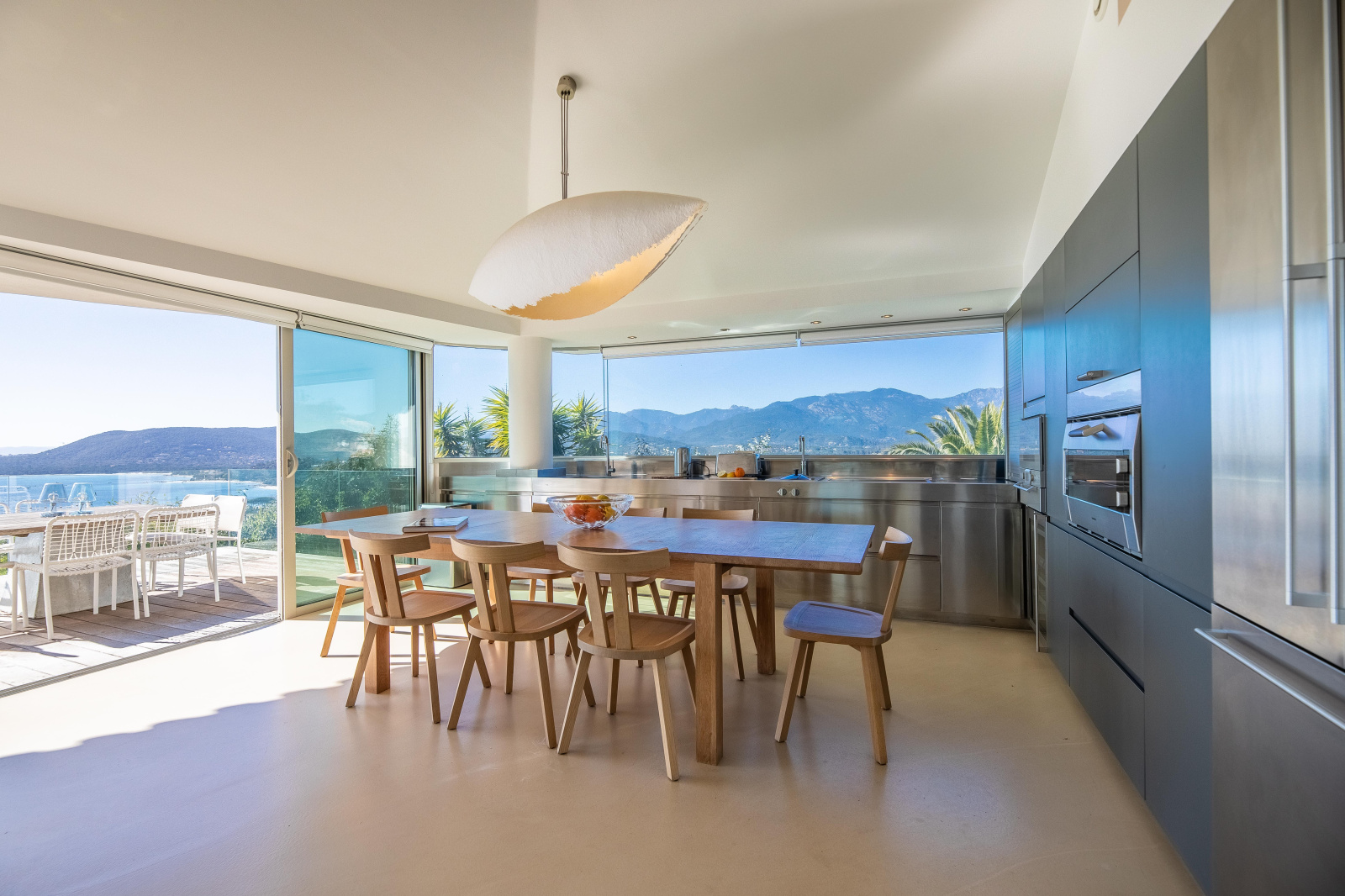 Un escalier mène à l’étage où le palier donne accès à une grande chambre avec salle de bains (baignoire offrant une belle vue montagne, double vasque et douche à l’italienne) , un WC invités, une petite chambre double avec mezzanine et salle d’eau, une cuisine et un salon. Ce dernier, pièce maîtresse, est édifié autour d’une structure vitrée arrondie mettant en valeur le panorama exceptionnel. La cuisine est parfaitement équipée (de marque Gaggenau avec plaque vitro-céramique, cuisson vapeur, four, micro-onde, frigo américain), avec un plan de travail en inox, une large table et une double vue sur la baie de Pinarello et les aiguilles de Bavella.