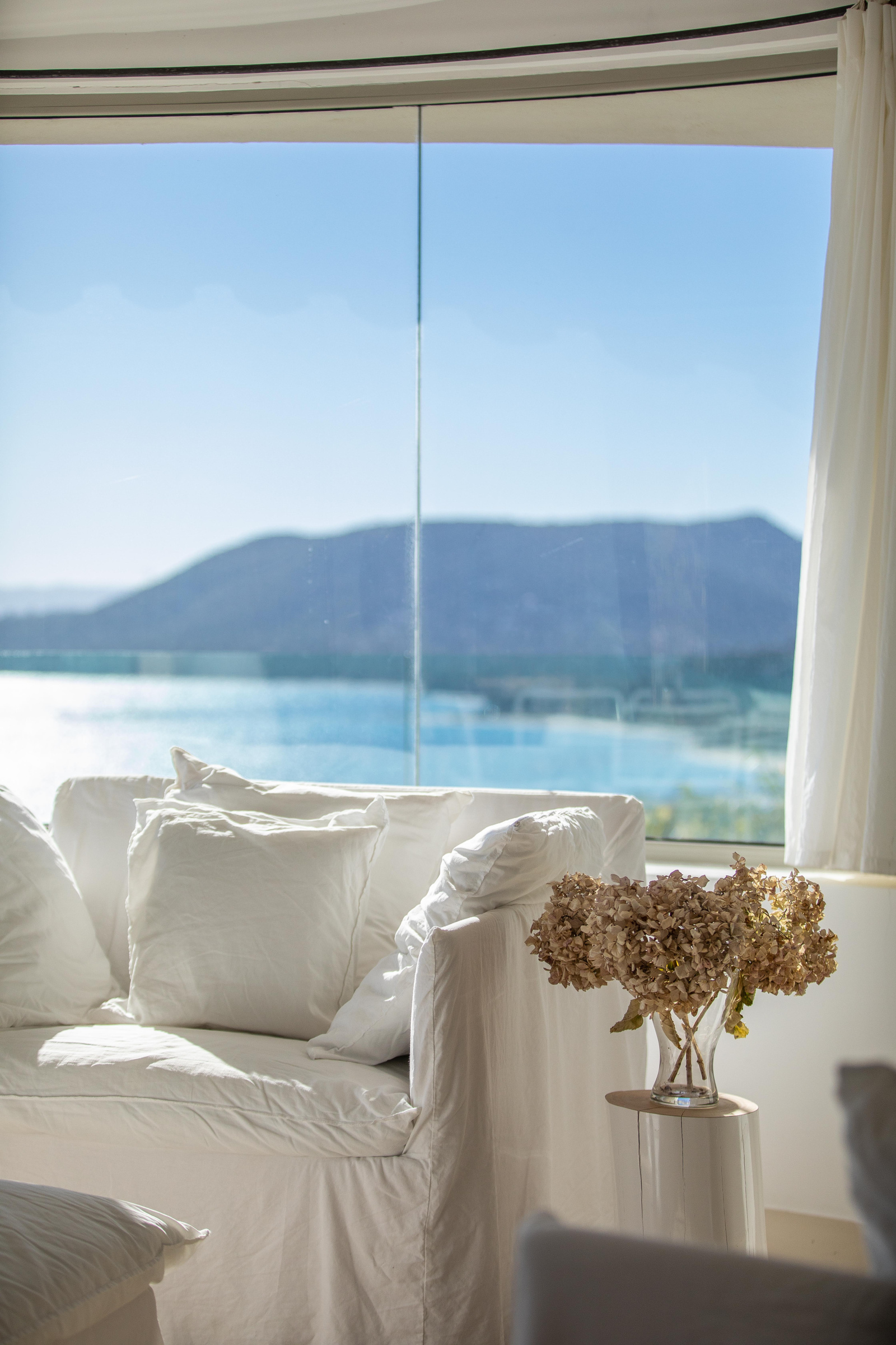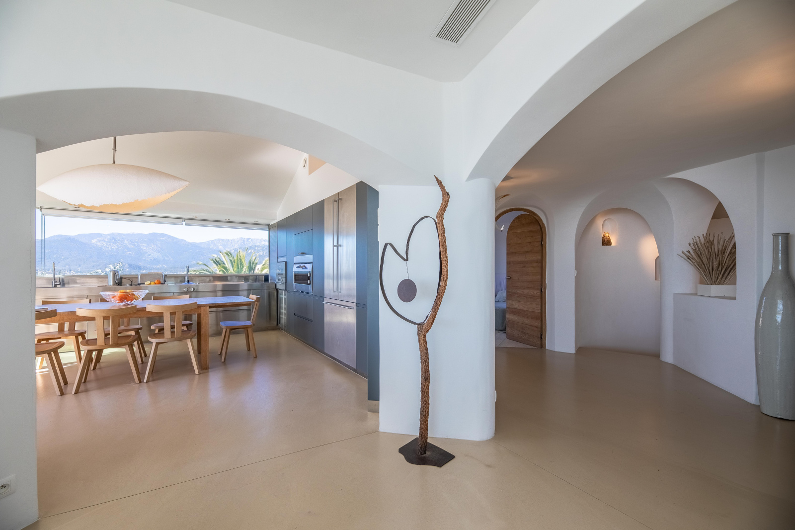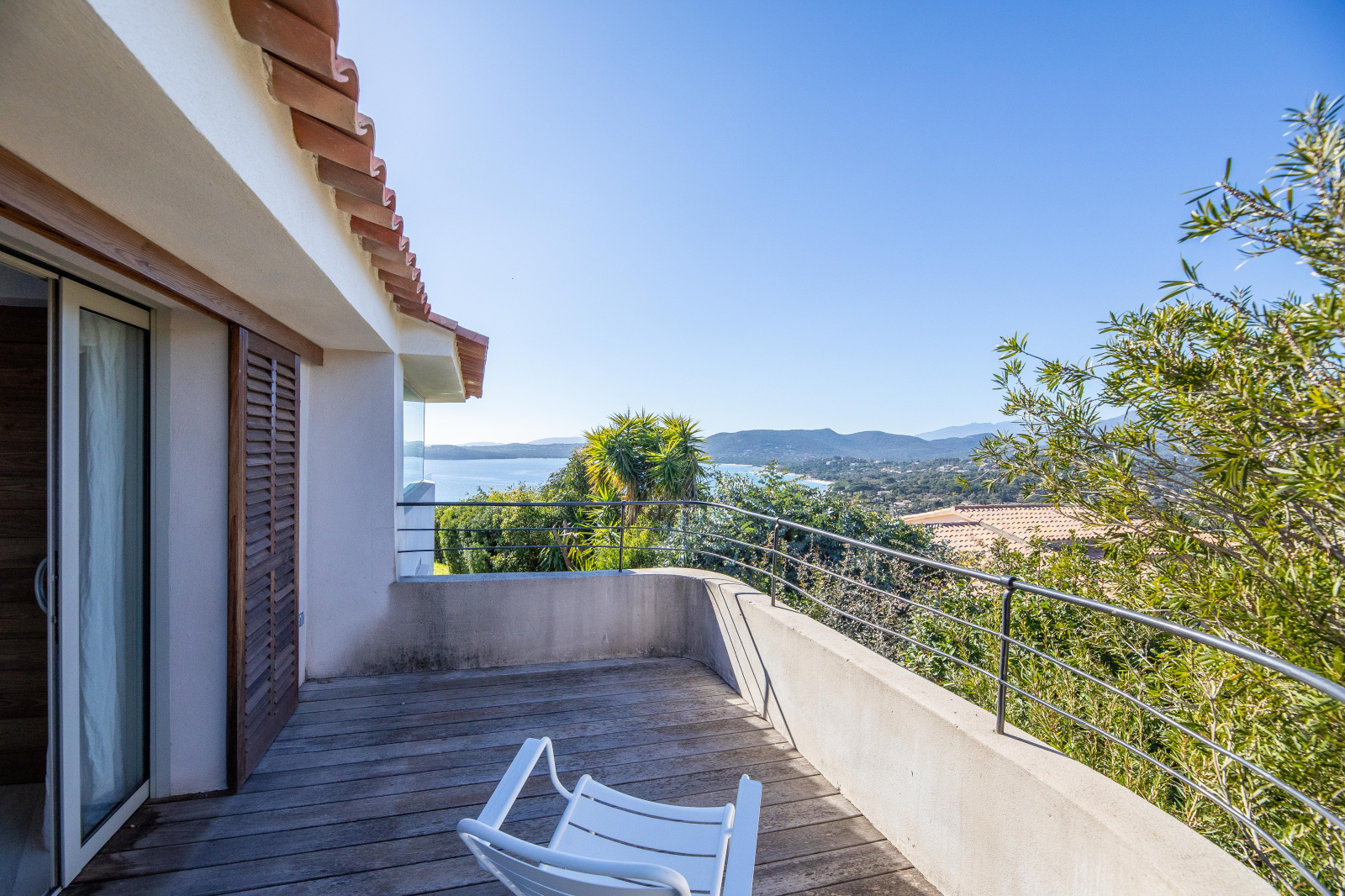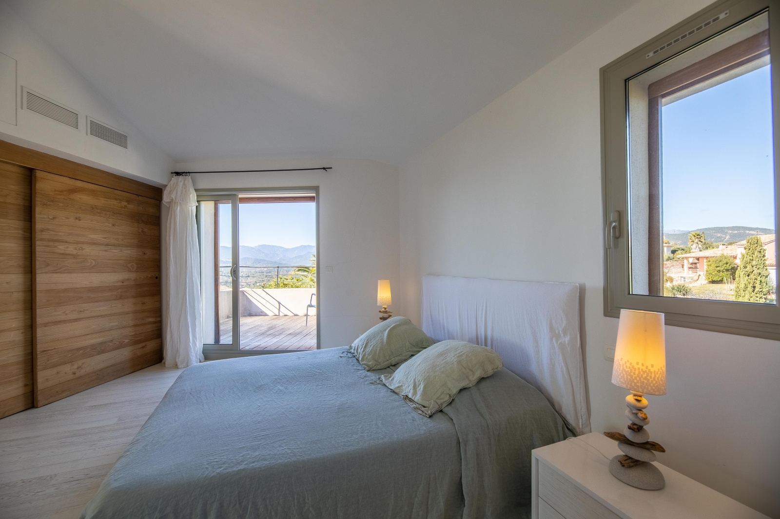 Un escalier mène à l’étage où le palier donne accès à une grande chambre avec salle de bains (baignoire offrant une belle vue montagne, double vasque et douche à l’italienne) , un WC invités, une petite chambre double avec mezzanine et salle d’eau, une cuisine et un salon. Ce dernier, pièce maîtresse, est édifié autour d’une structure vitrée arrondie mettant en valeur le panorama exceptionnel. La cuisine est parfaitement équipée (de marque Gaggenau avec plaque vitro-céramique, cuisson vapeur, four, micro-onde, frigo américain), avec un plan de travail en inox, une large table et une double vue sur la baie de Pinarello et les aiguilles de Bavella.