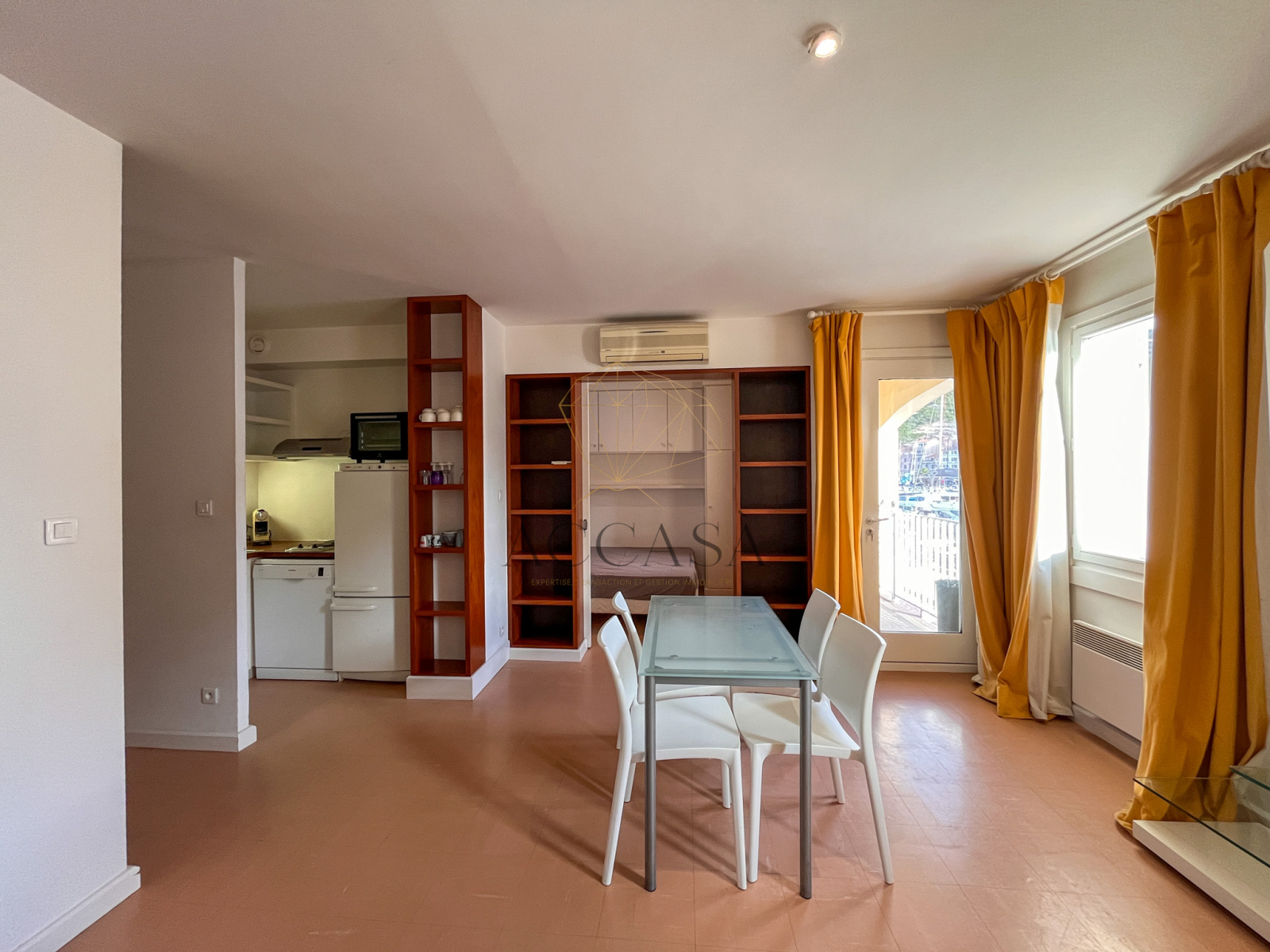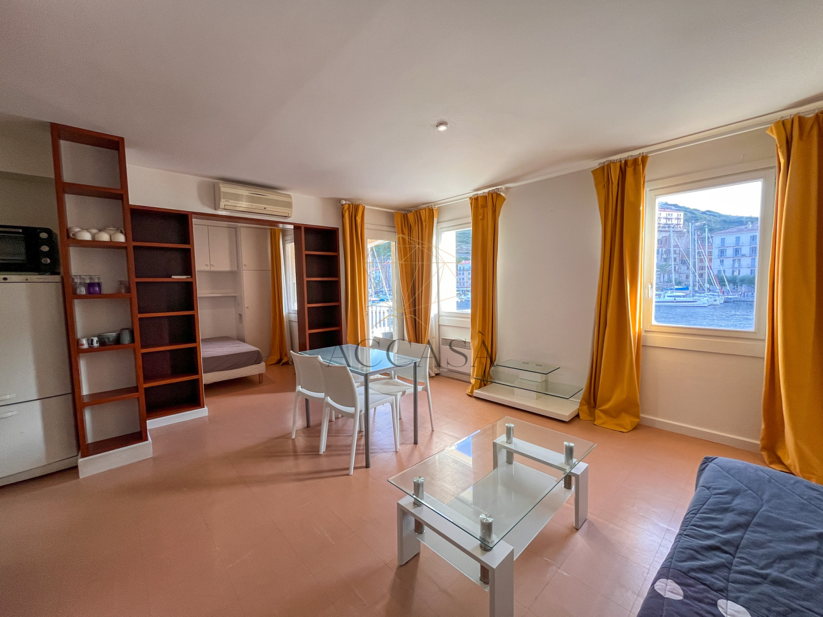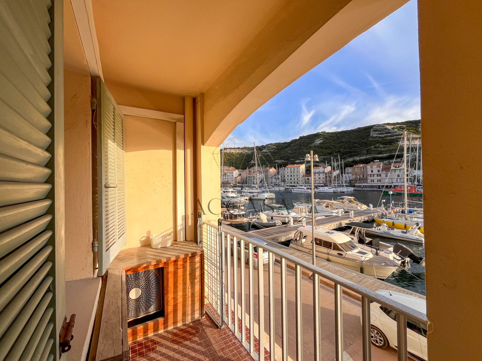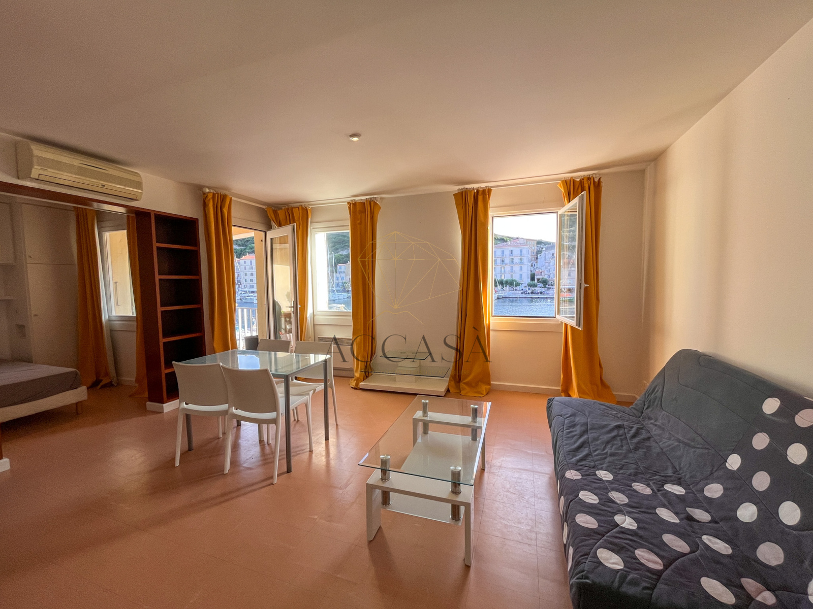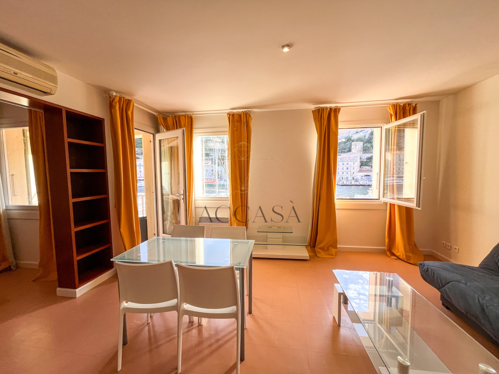 Le salon/séjour, baigné de lumière grâce à ses deux grandes fenêtres exposées Sud et une porte-fenêtre, s’ouvre sur une terrasse offrant une vue à couper le souffle sur le port animé et la majestueuse citadelle. De jour comme de nuit, le va-et-vient constant des bateaux et ce panorama unique créent un spectacle captivant et apaisant, dont vous ne vous lasserez jamais.