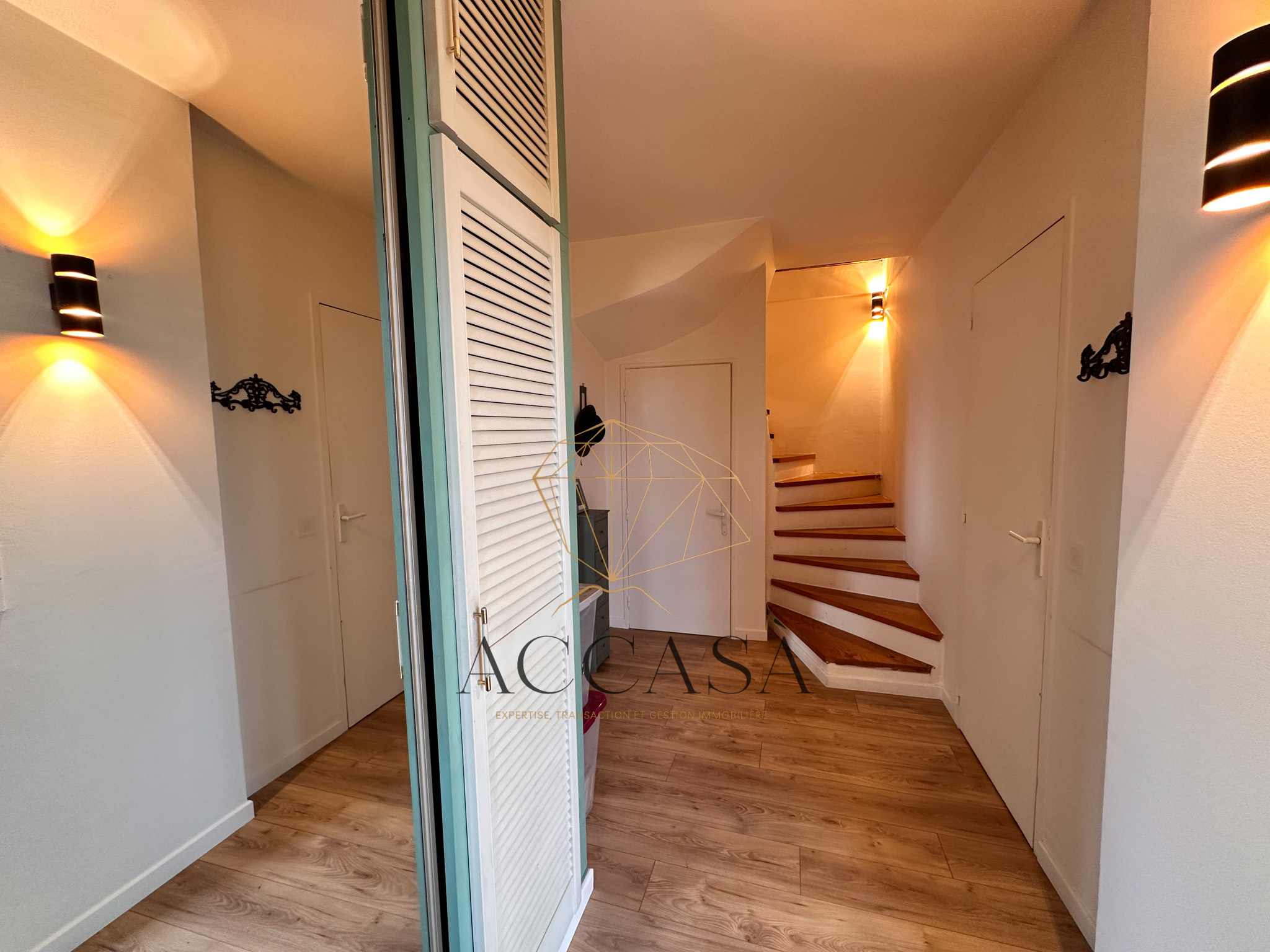 Le premier niveau se compose d’une entrée avec placard, d’un séjour lumineux avec parquet et climatisation, ouvrant sur une terrasse couverte, d’un WC indépendant, ainsi que d’une cuisine avec portes-fenêtres à galandage donnant également accès à une terrasse couverte, complétée par un cellier.