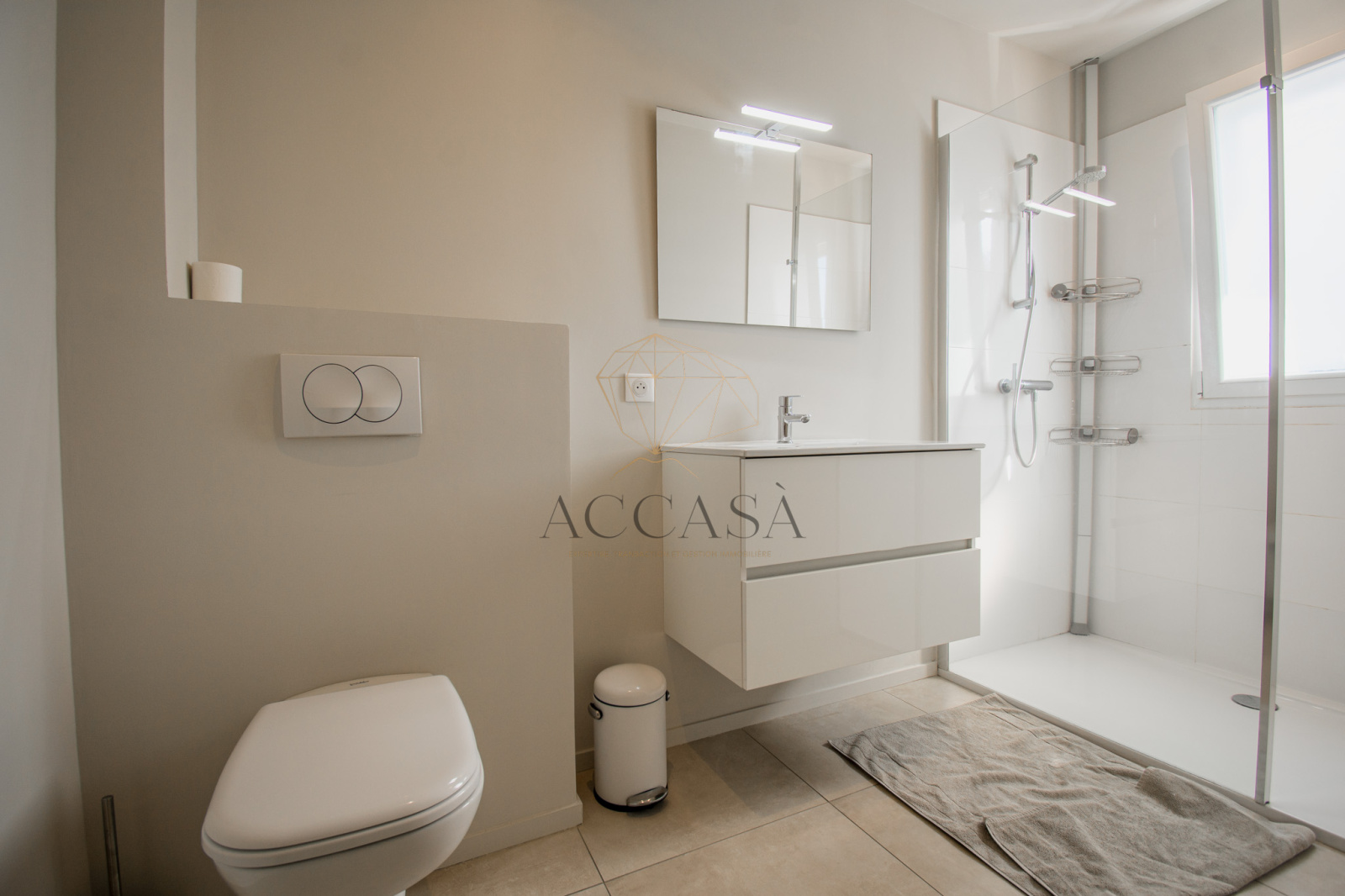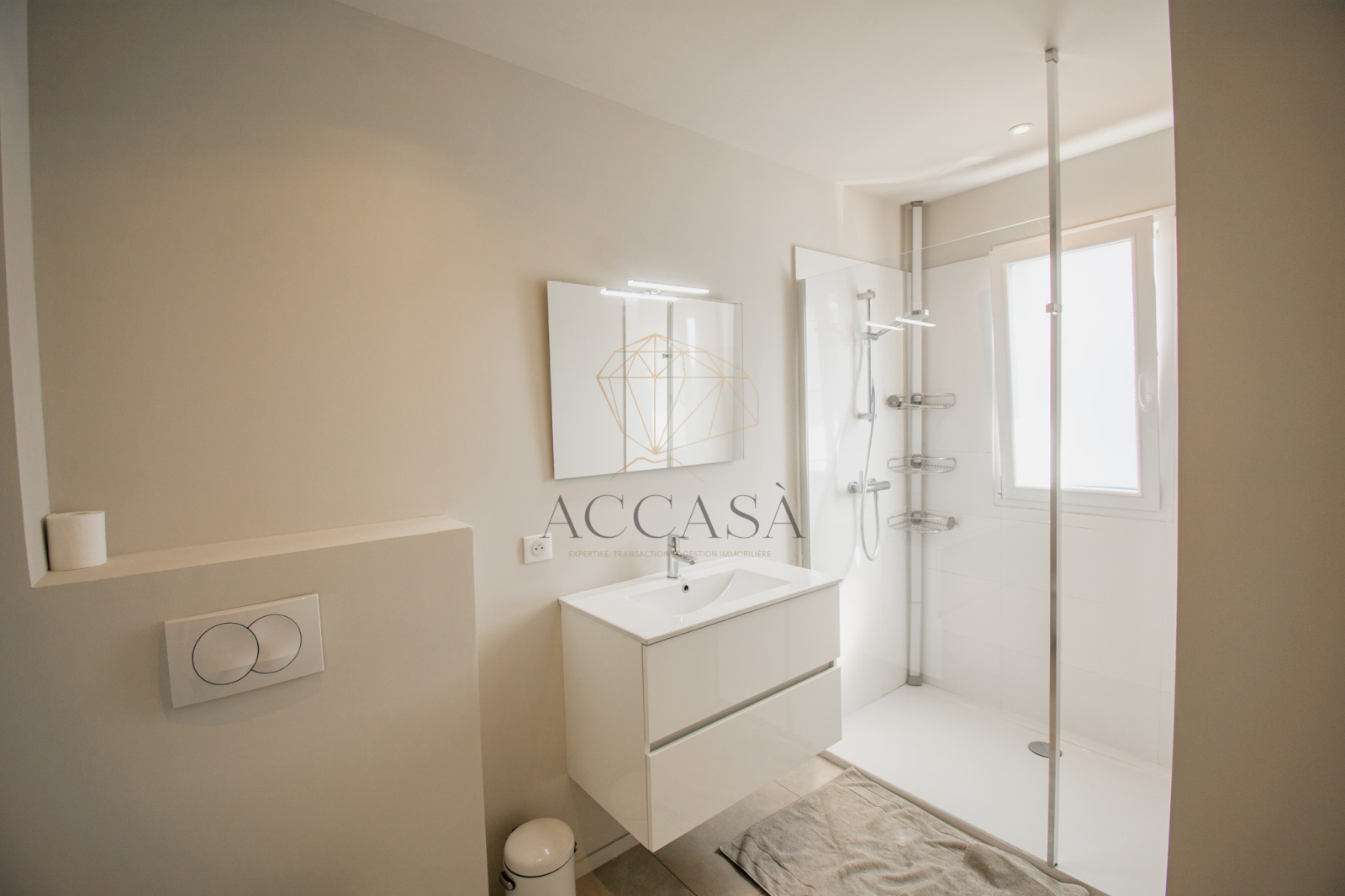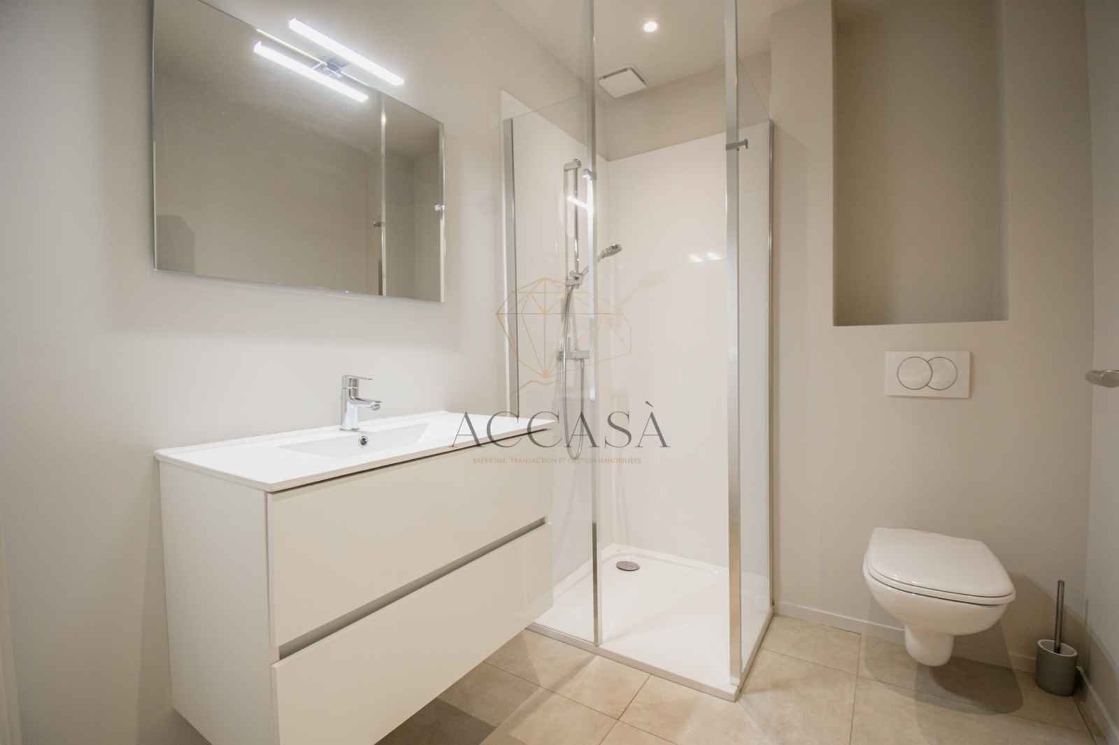 L'appartement se compose d'une entrée, d'une salle d'eau équipée de toilettes suspendus, d'un lavabo et d'une douche à l'italienne. Il dispose également d'une suite avec chambre, salle d'eau attenante (comprenant lavabo, toilettes suspendus et douche à l'italienne) ainsi qu'une loggia de 6,46 m². Une deuxième chambre, un séjour-cuisine lumineux s'ouvrant sur une terrasse complètent l'espace de vie.