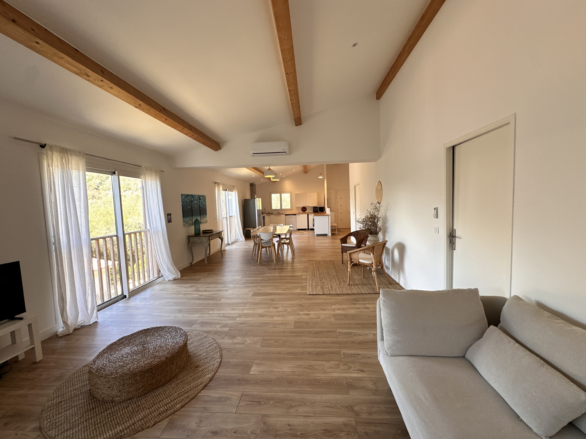 La maison propose de beaux volumes avec un espace de vie confortable d’environ 65 m², une cuisine ouverte, trois chambres dont une avec salle d’eau privative, une salle de bain avec baignoire et douche à l'italienne ainsi qu’un WC indépendant. Les prestations sont récentes et adaptées à un usage résidentiel de qualité, avec climatisation dans toutes les pièces et de larges ouvertures sur l’extérieur.
