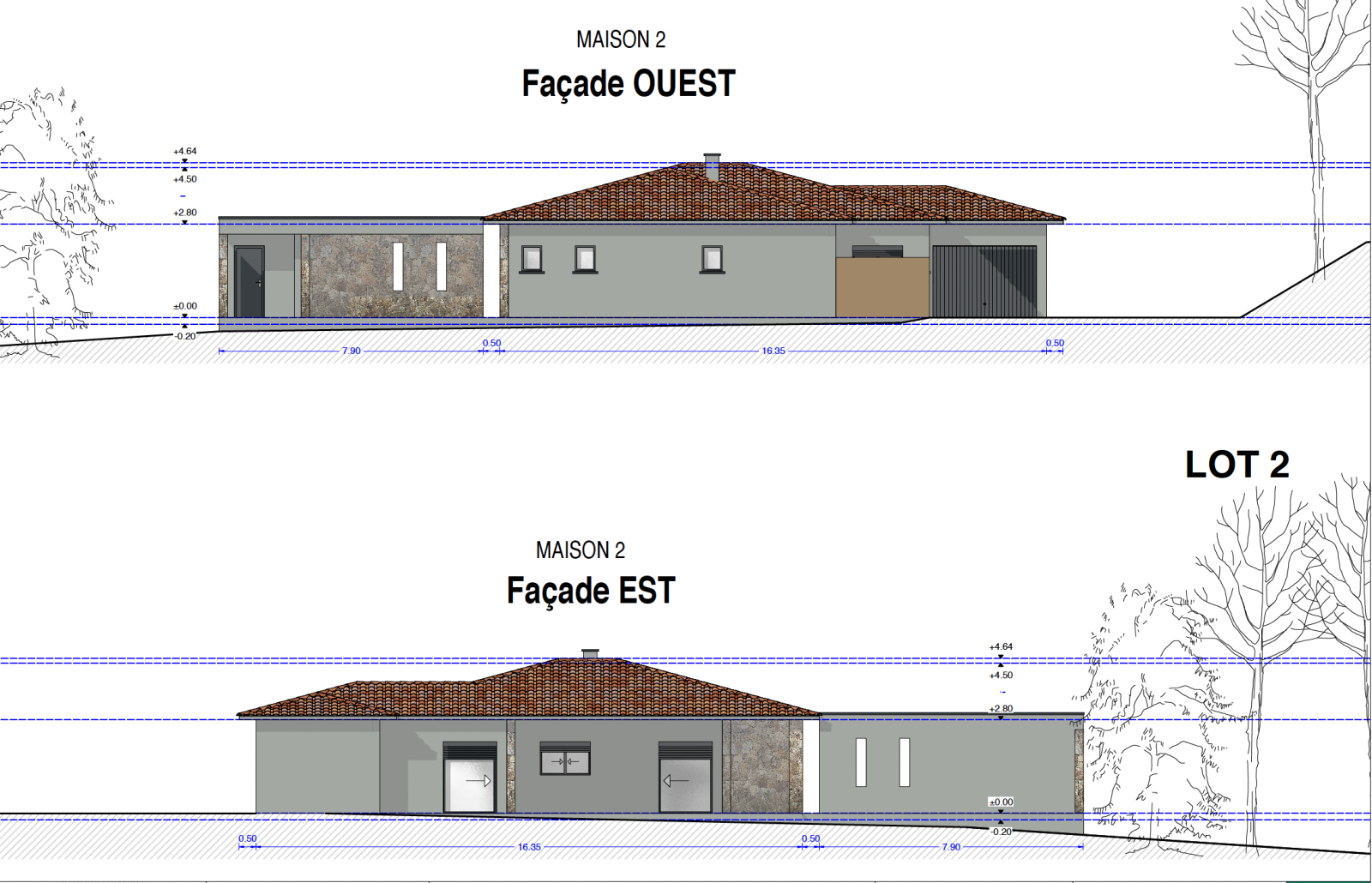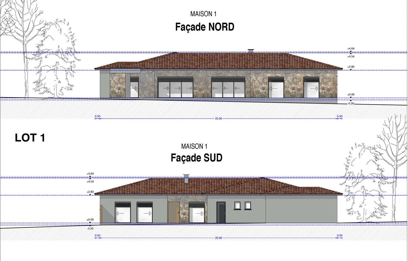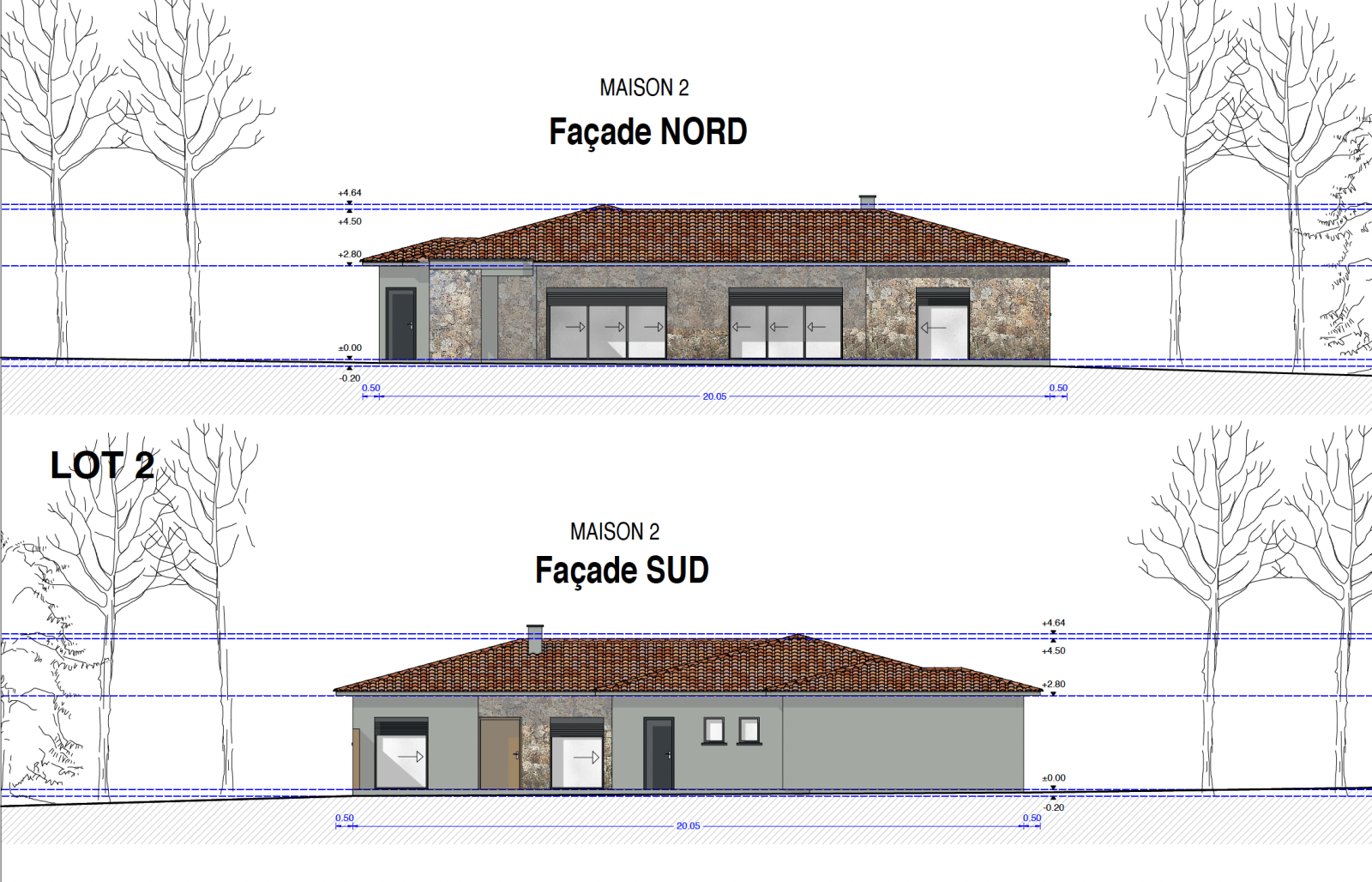 Les façades principales seront toutes disposées dans un axe permettant un ensoleillement agréable tout en gardant des zones d'ombres le long de la journée permettant aussi de proposer des terrasses agréables à vivre et elles seront implantées parallèlement aux courbes de niveau du terrain évitant ainsi des terrassements trop importants. Certaines façades seront habillées en pierre locale pour intégration parfaite avec le voisinage existant. Les couvertures seront réalisées en vieilles tuiles renforçant aussi l'intégration dans le paysage.