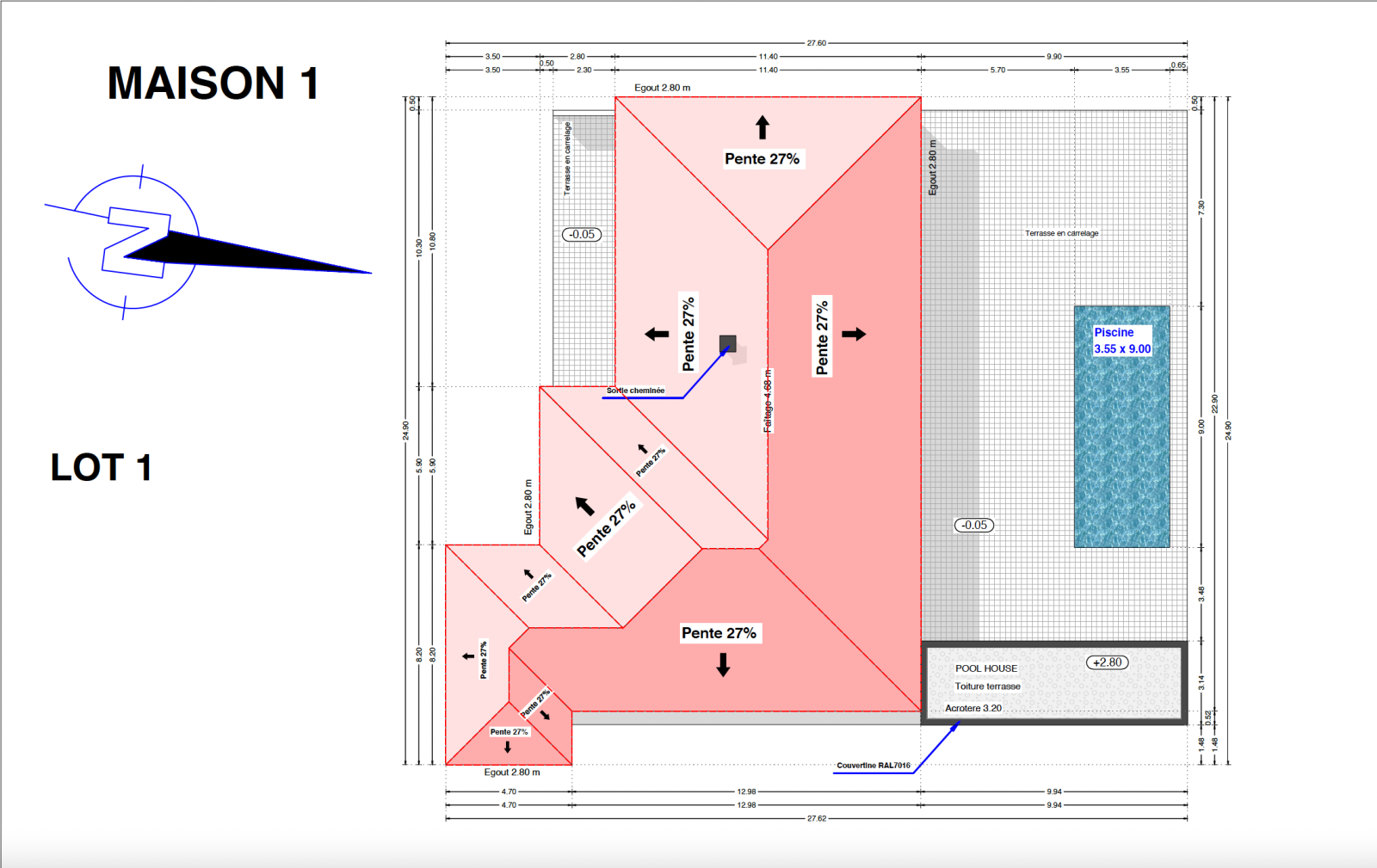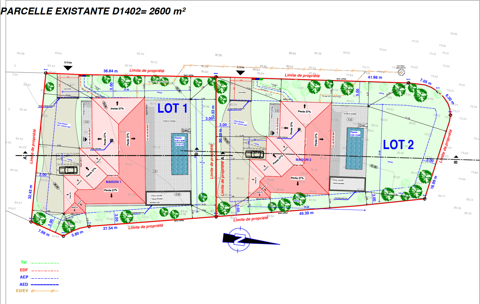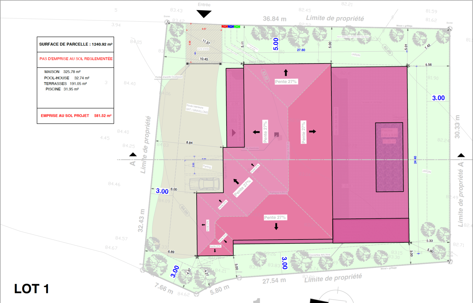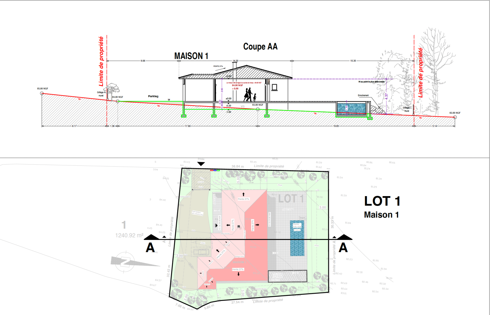 - lot 1 d'une surface de 1240m² avec villa de 165 m² habitables +piscine de 9x3,55 m
