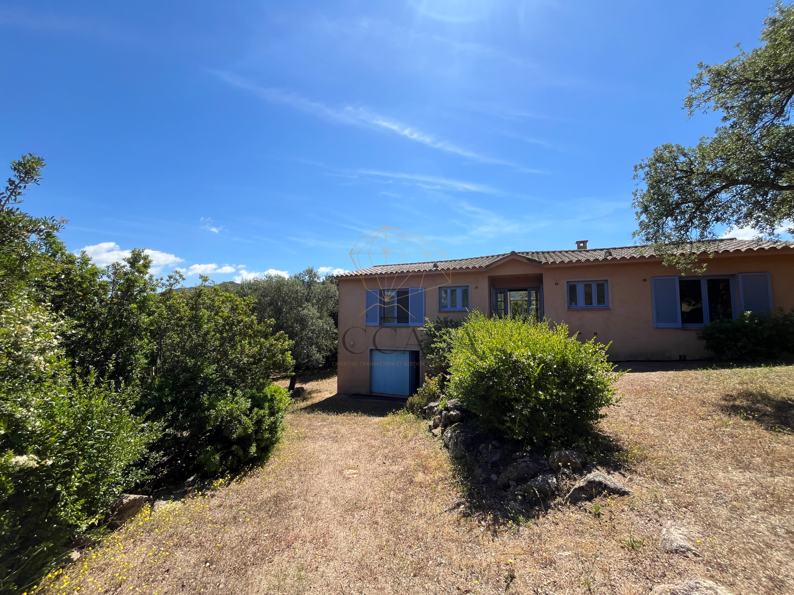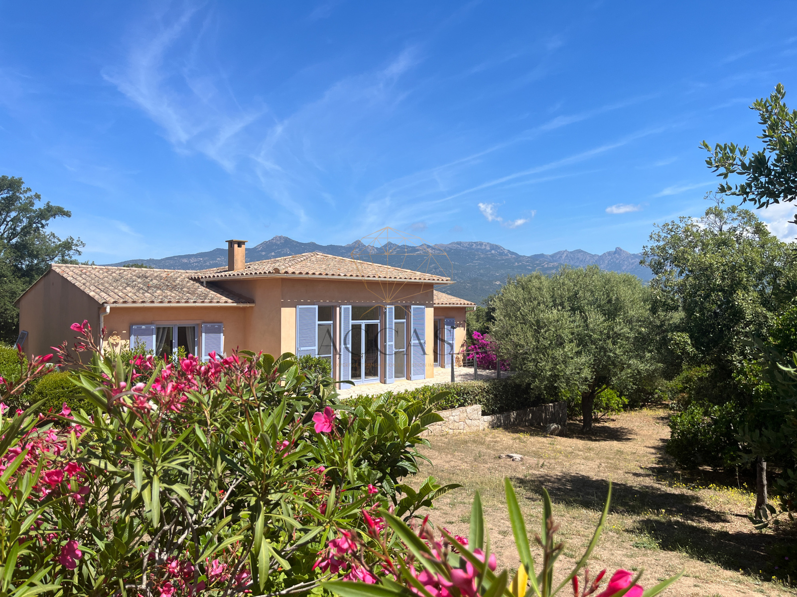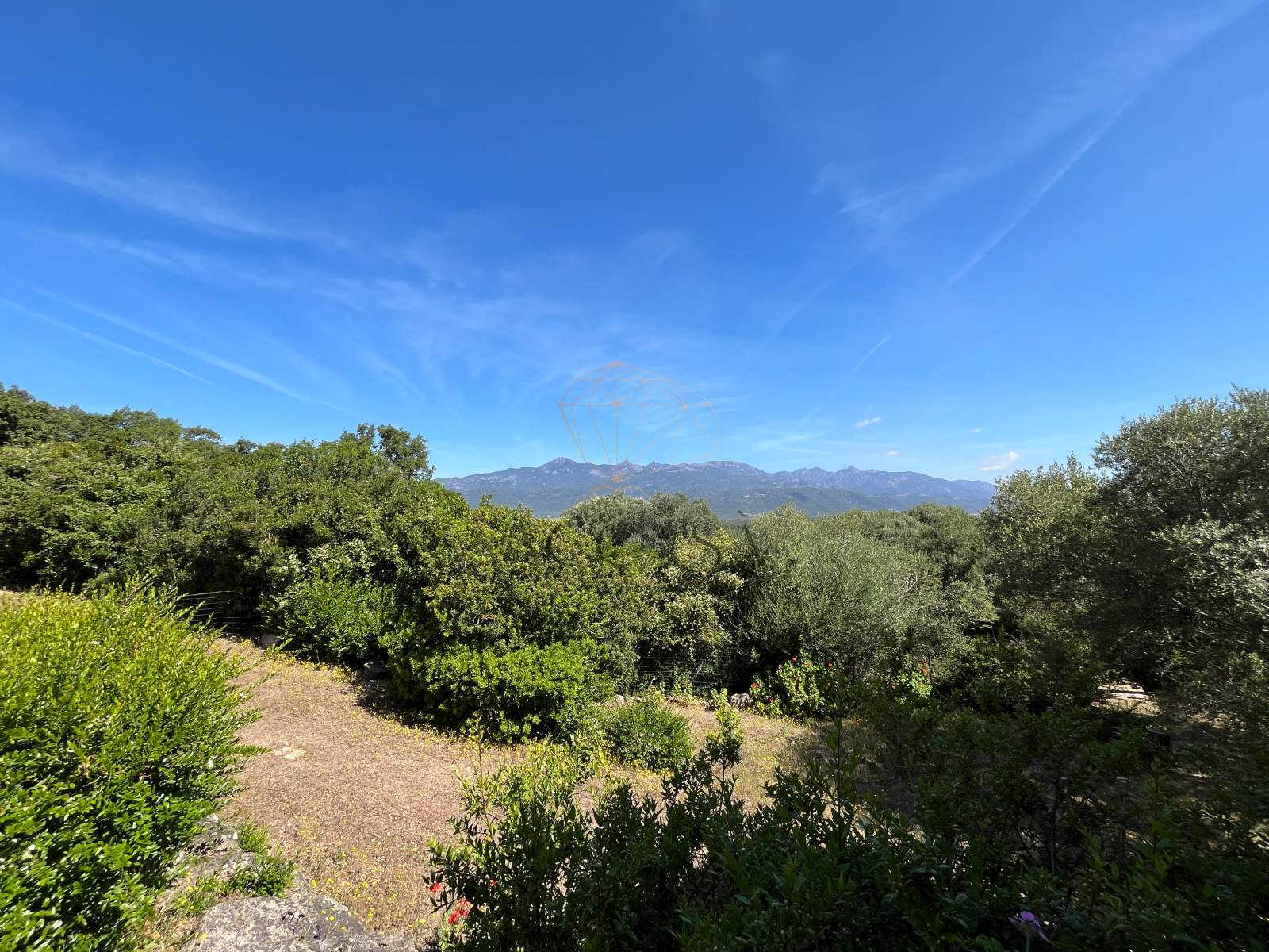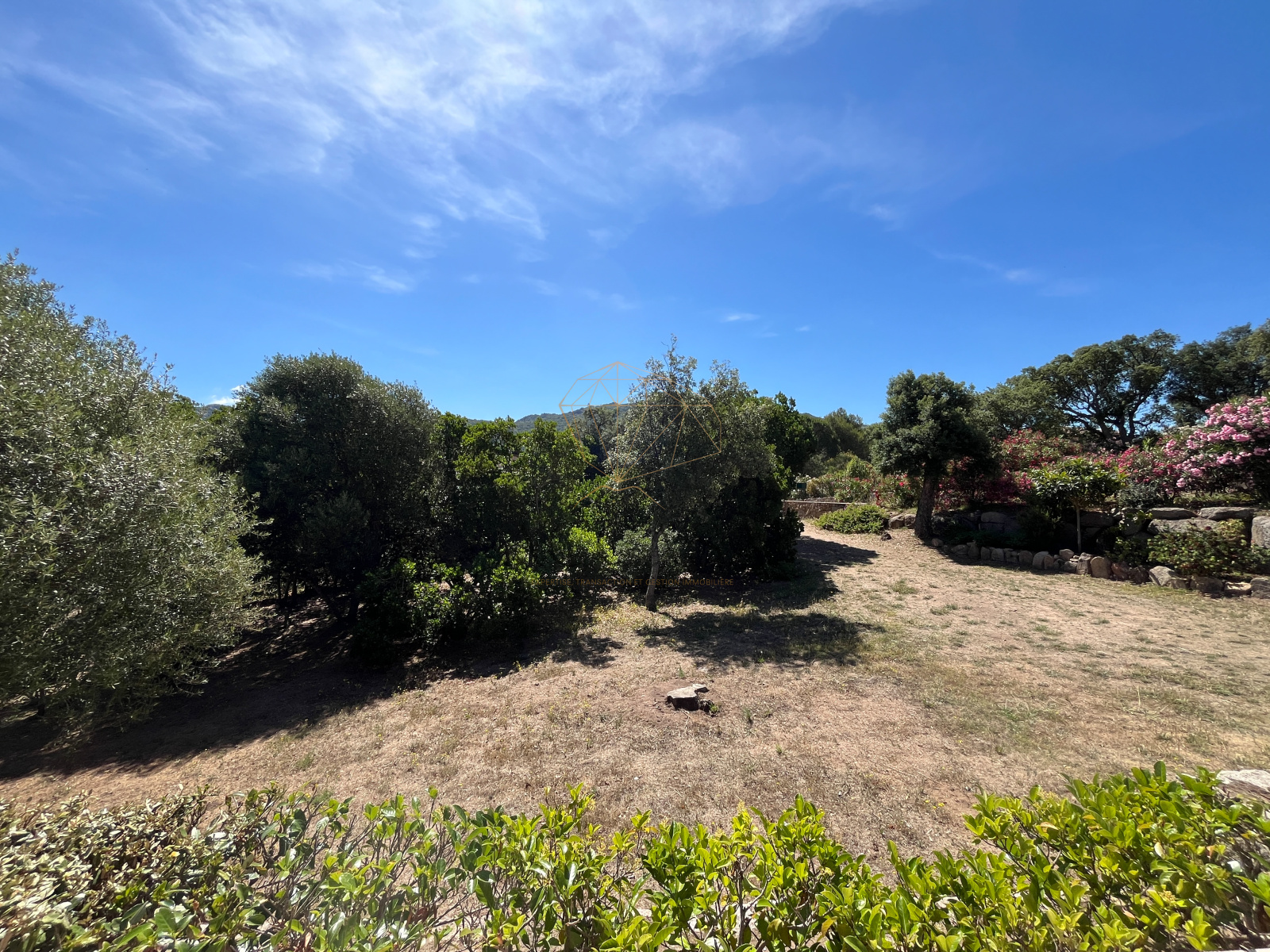 Le terrain, planté d'oliviers, d'arbousiers, d'agrumes et de chênes, assure intimité et tranquillité avec une vue magnifique sur l'Omu di Cagna, le tout sans vis-a-vis. La propriété est raccordée au tout-à-l'égout et offre la possibilité d'ajouter une piscine.