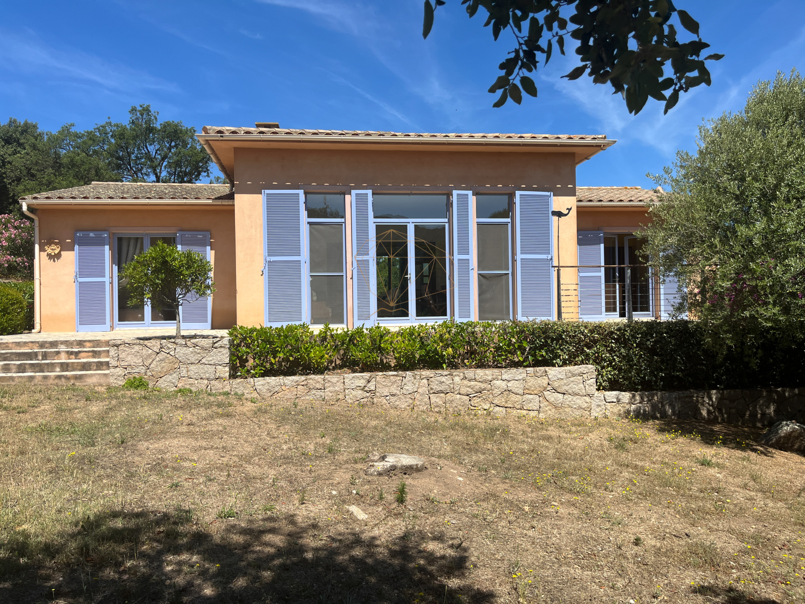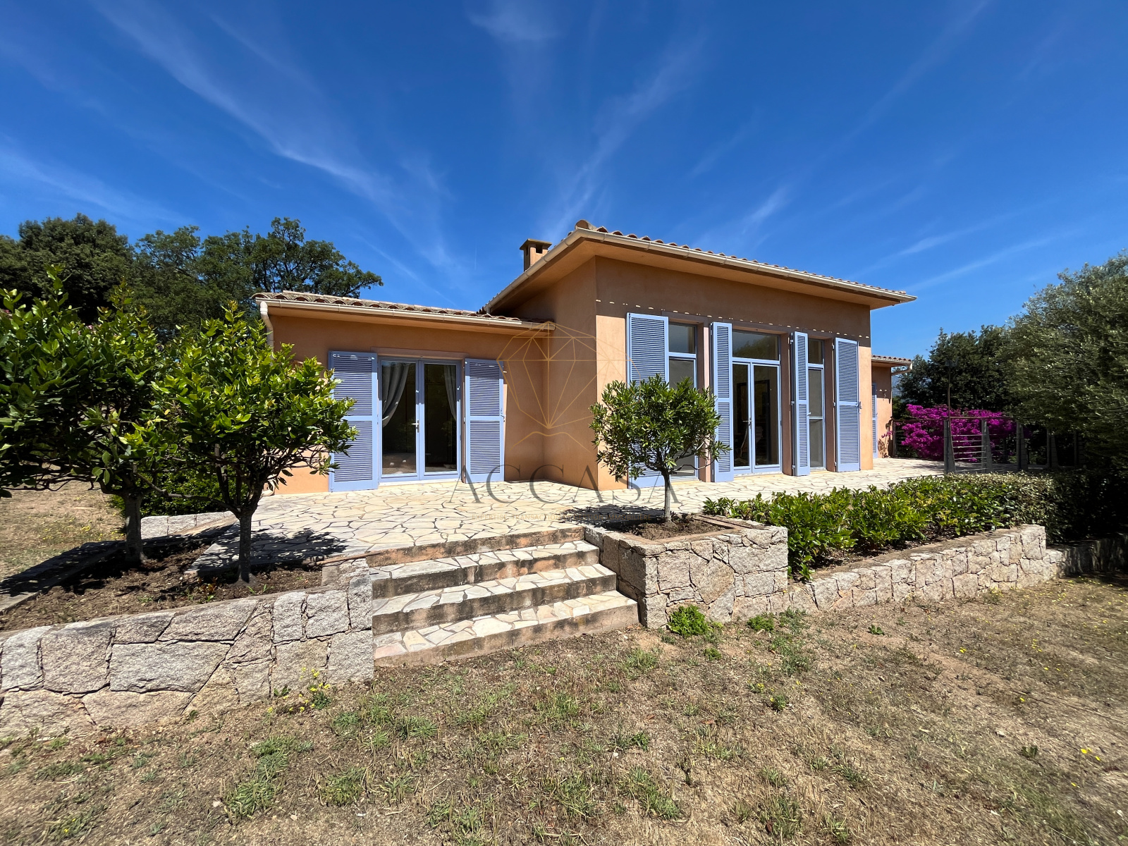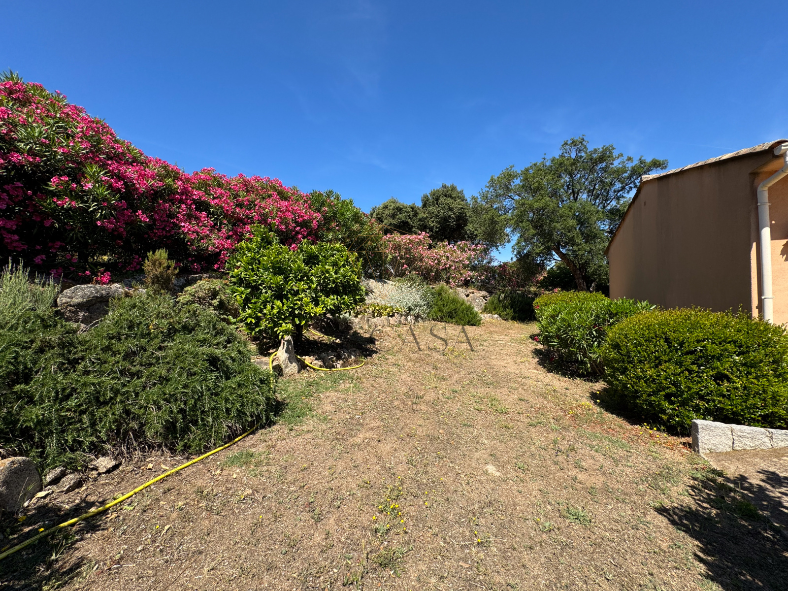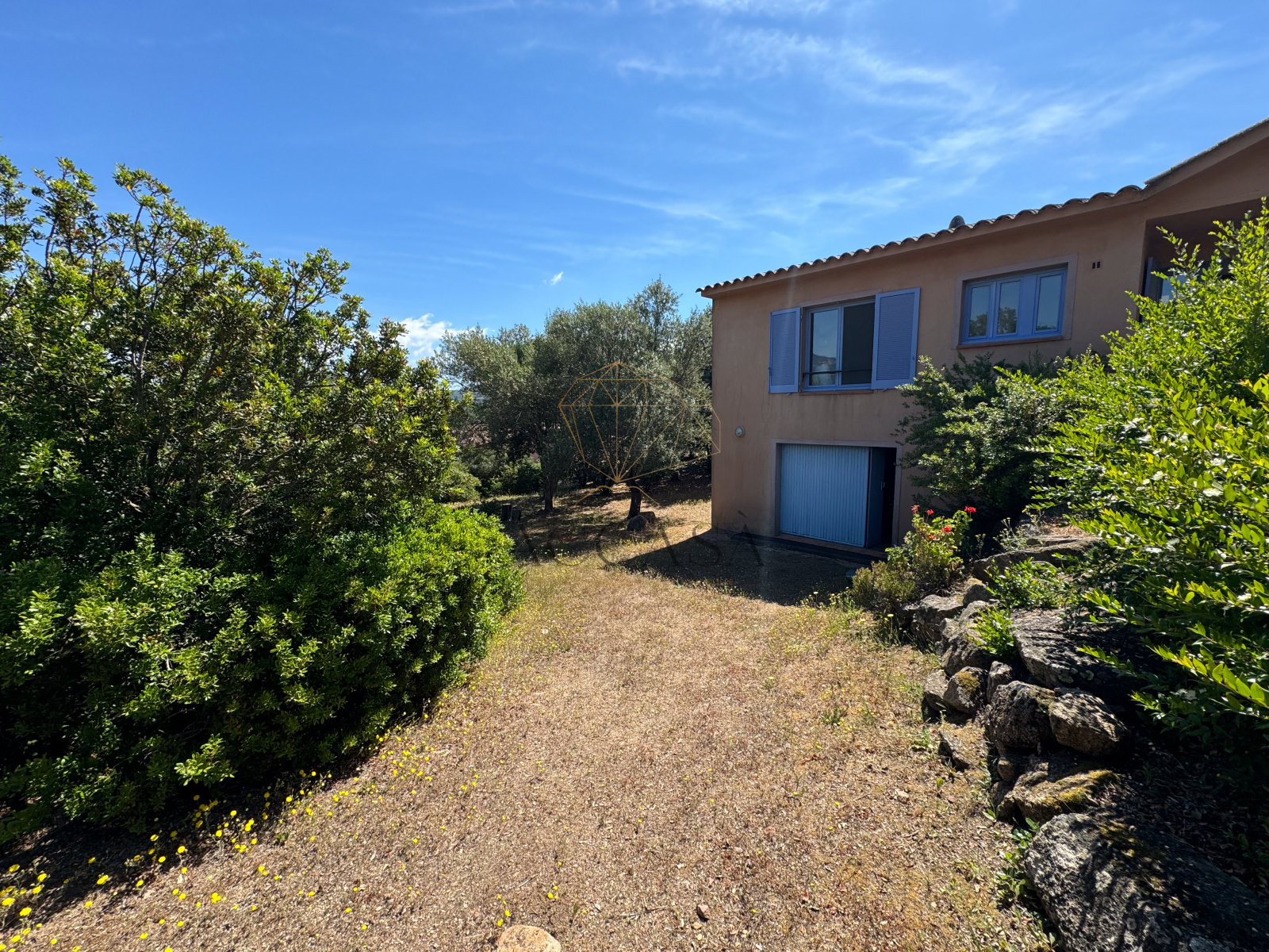 Le terrain, planté d'oliviers, d'arbousiers, d'agrumes et de chênes, assure intimité et tranquillité avec une vue magnifique sur l'Omu di Cagna, le tout sans vis-a-vis. La propriété est raccordée au tout-à-l'égout et offre la possibilité d'ajouter une piscine.
