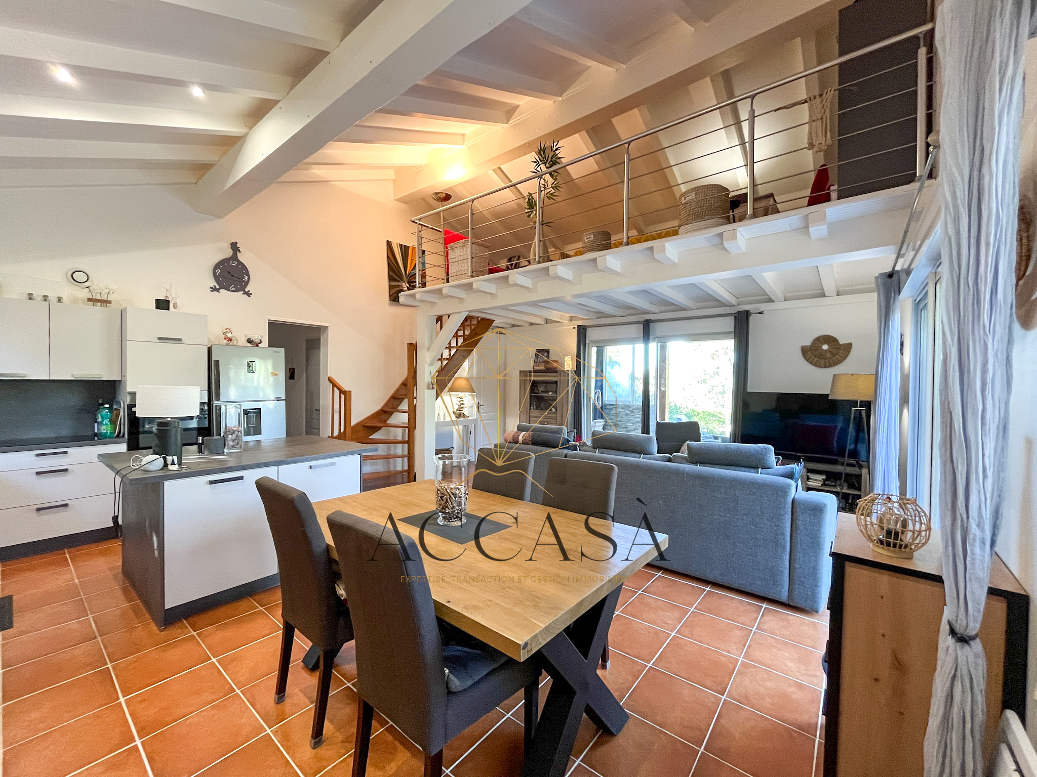 Construite en 2008, en ossature bois enduite, elle se compose d’un vaste séjour lumineux avec cuisine ouverte de 42 m², d’un bureau en mezzanine, d’un cellier, et d’une chambre parentale avec salle d’eau/WC privative en rez-de-chaussée.