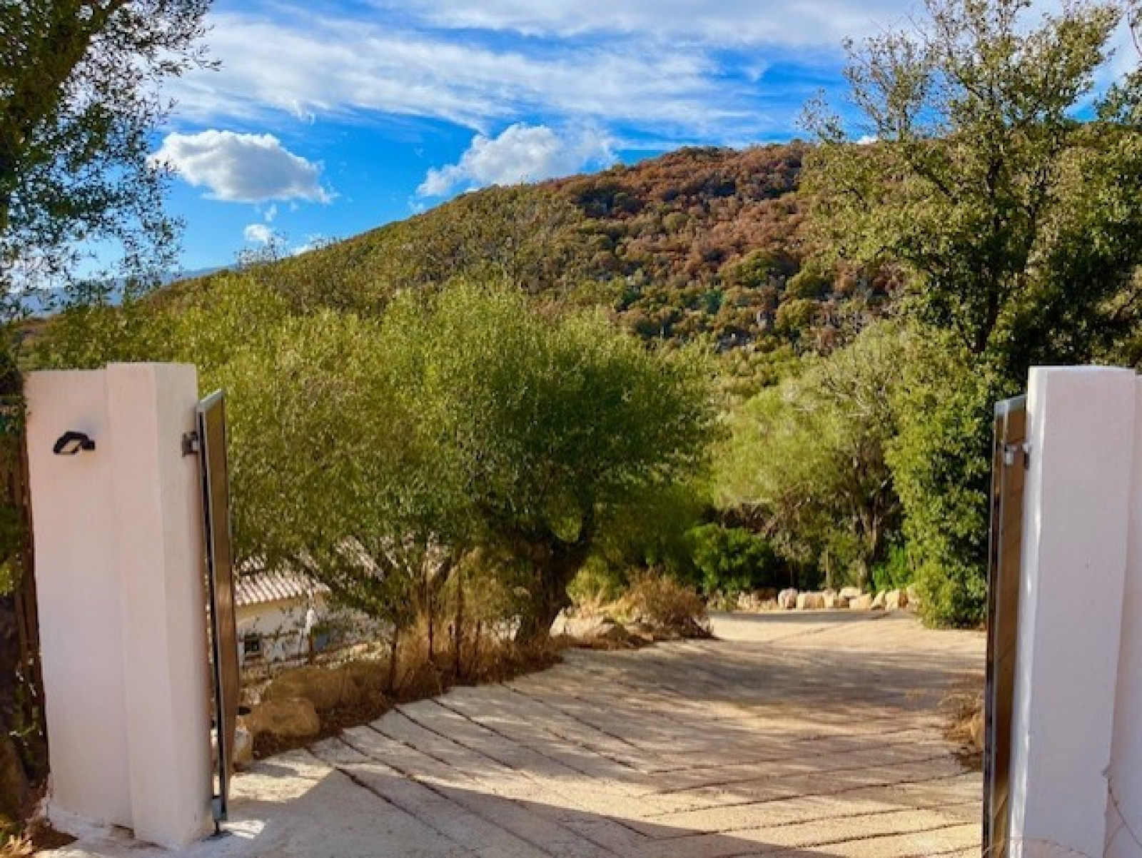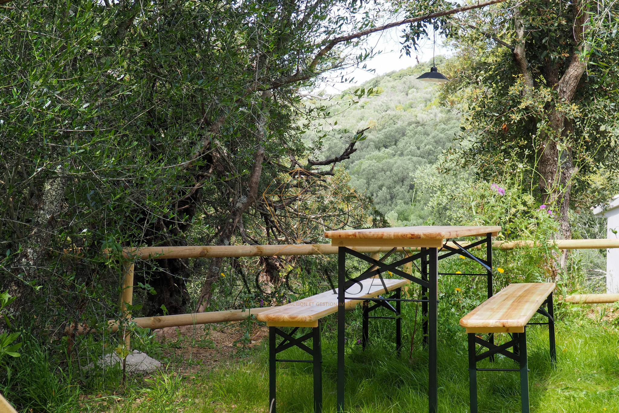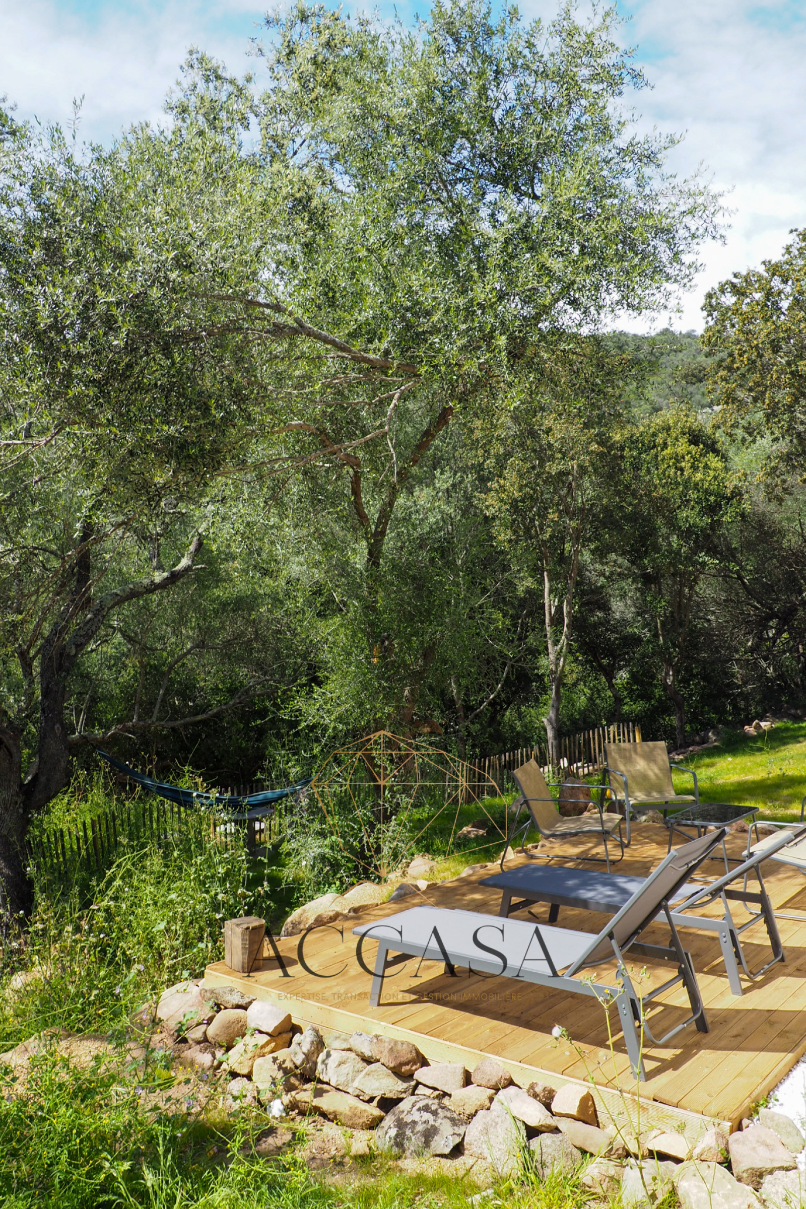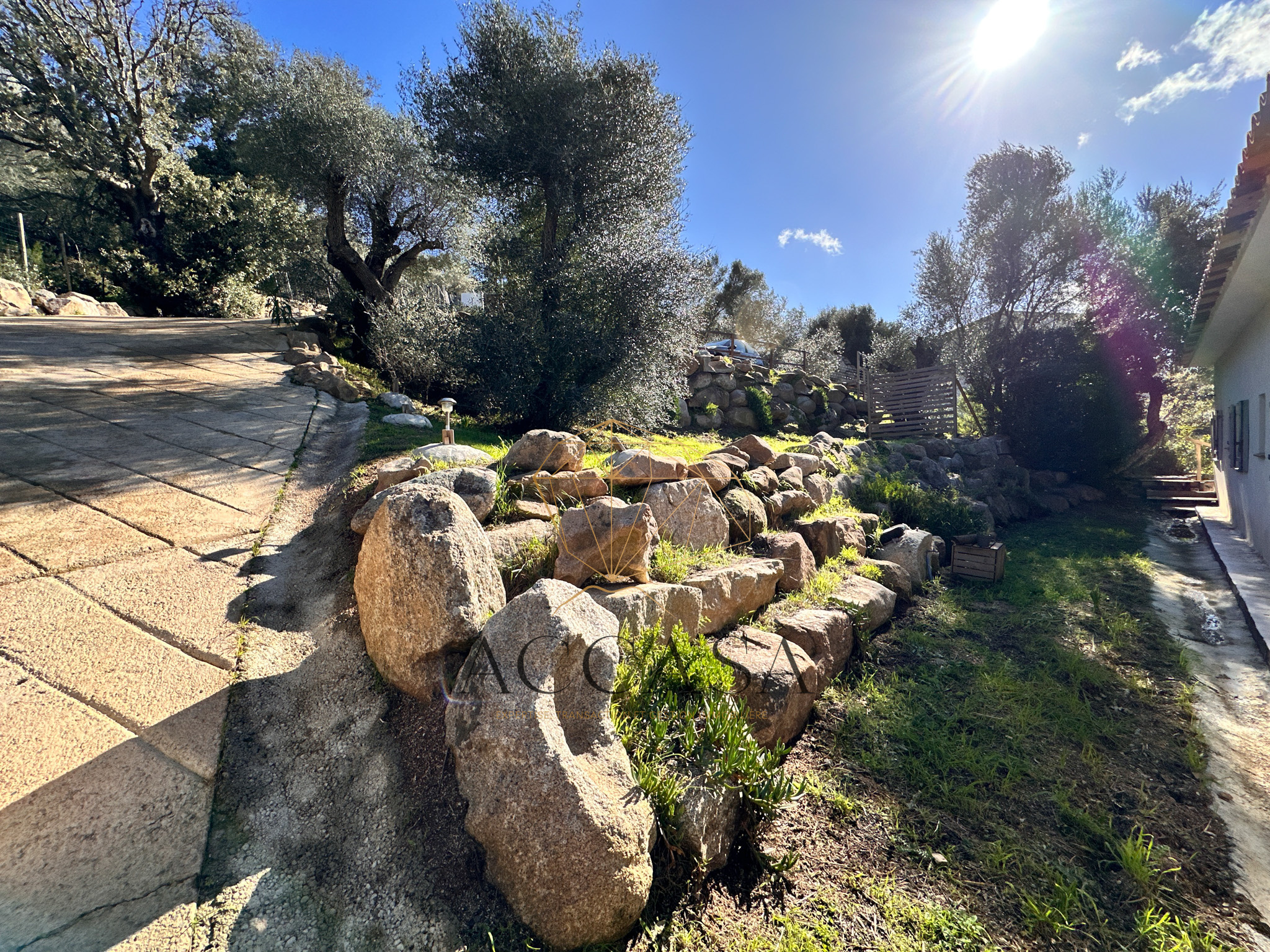 Le terrain est agrémenté de superbes enrochements naturels et d’oliviers pluri-centenaires et offre une vue dégagée sur les montagnes environnantes.