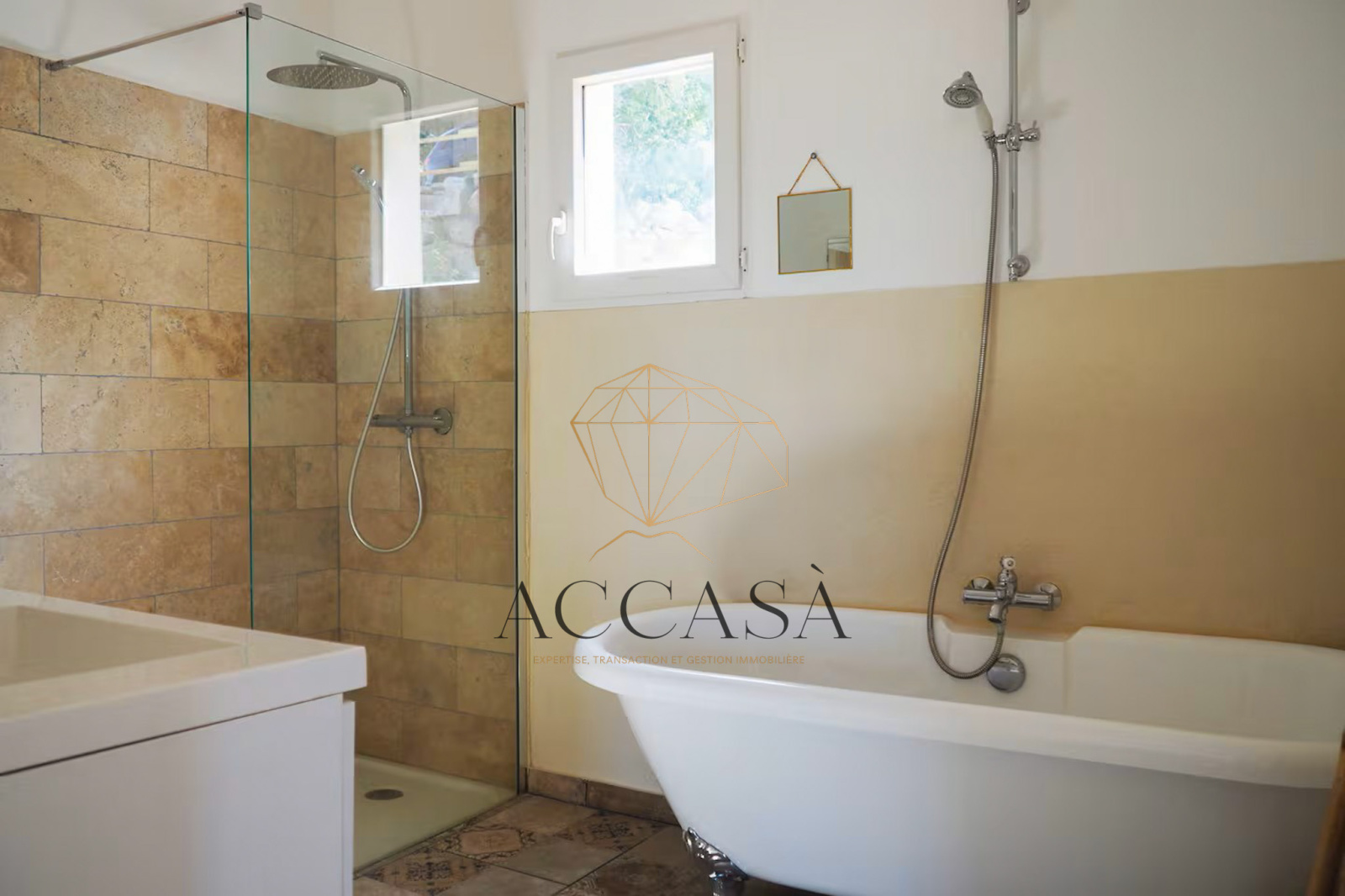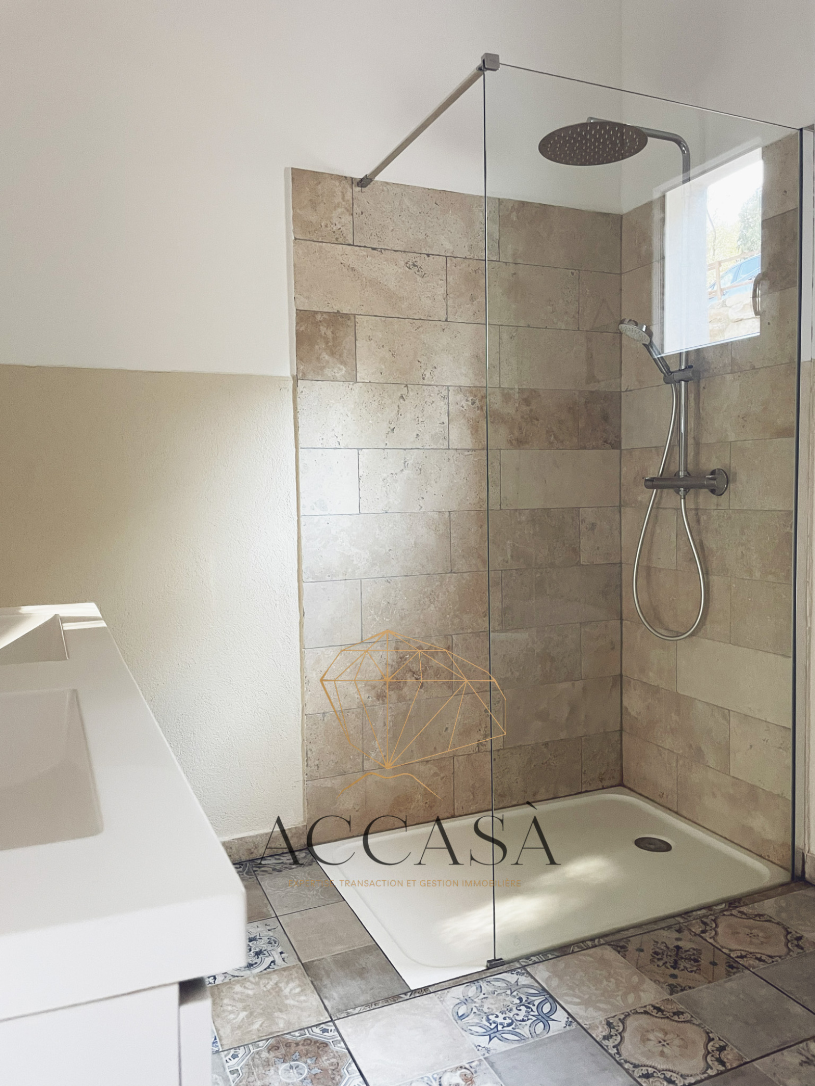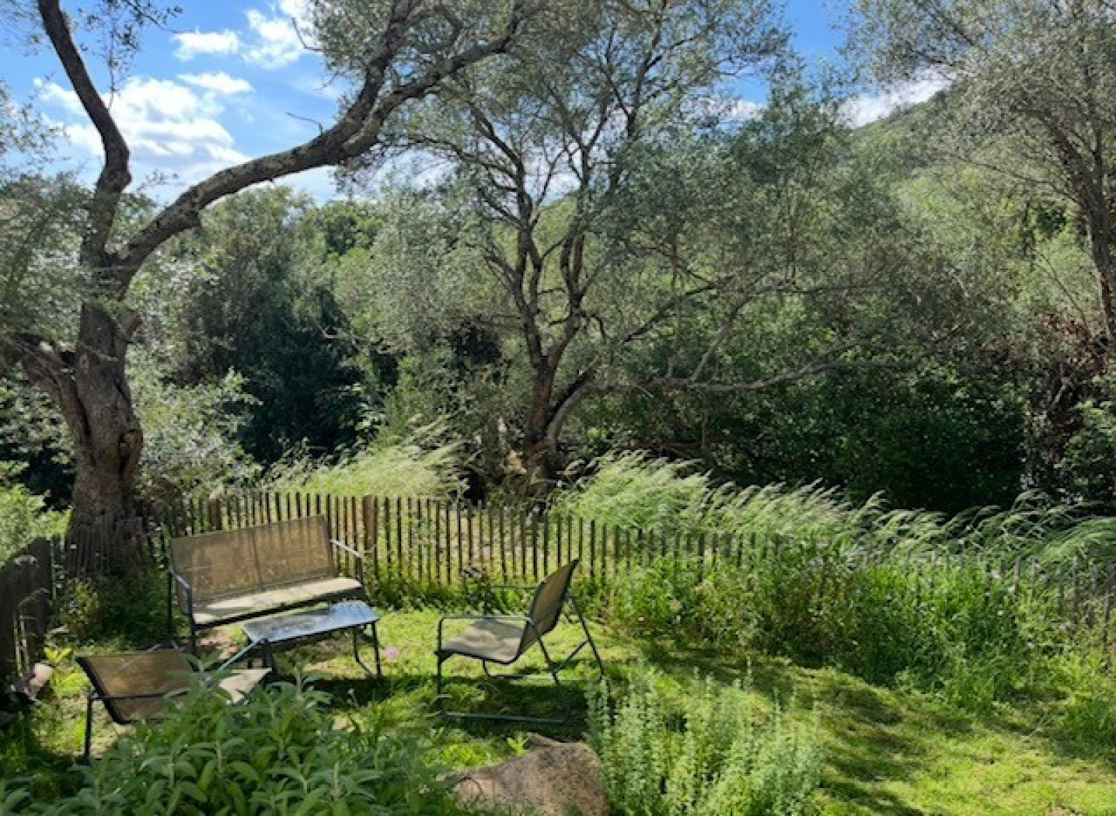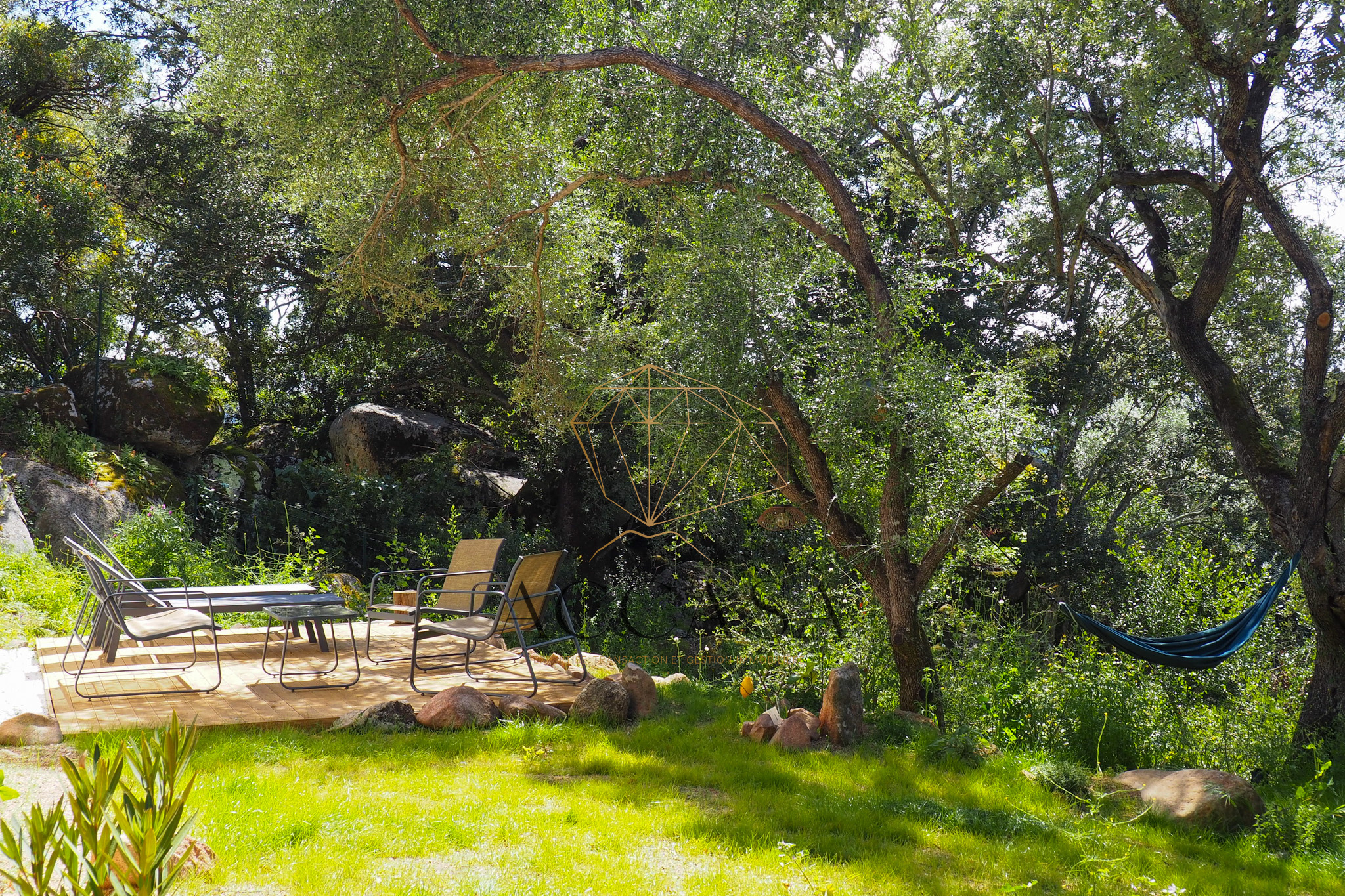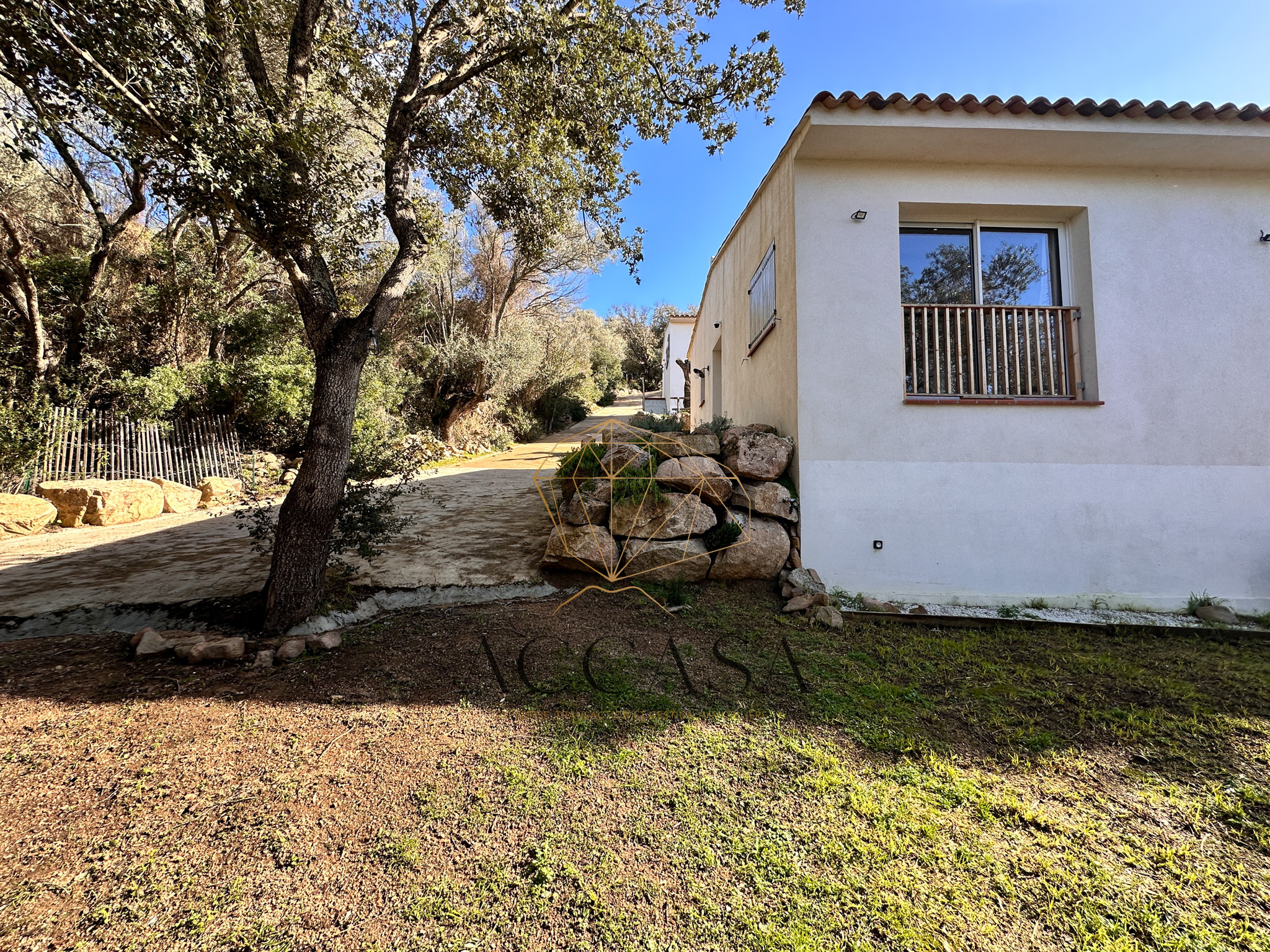 Le terrain est agrémenté de superbes enrochements naturels et d’oliviers pluri-centenaires et offre une vue dégagée sur les montagnes environnantes.