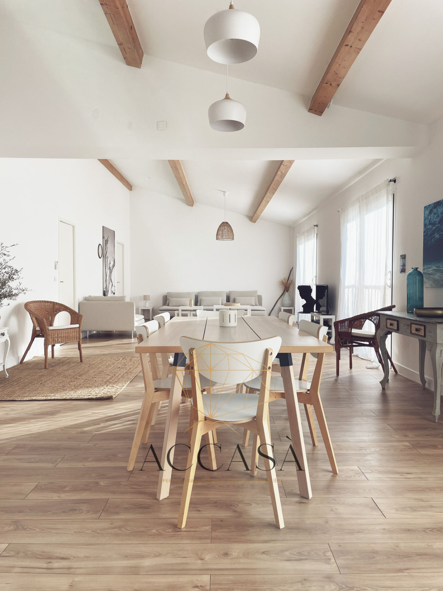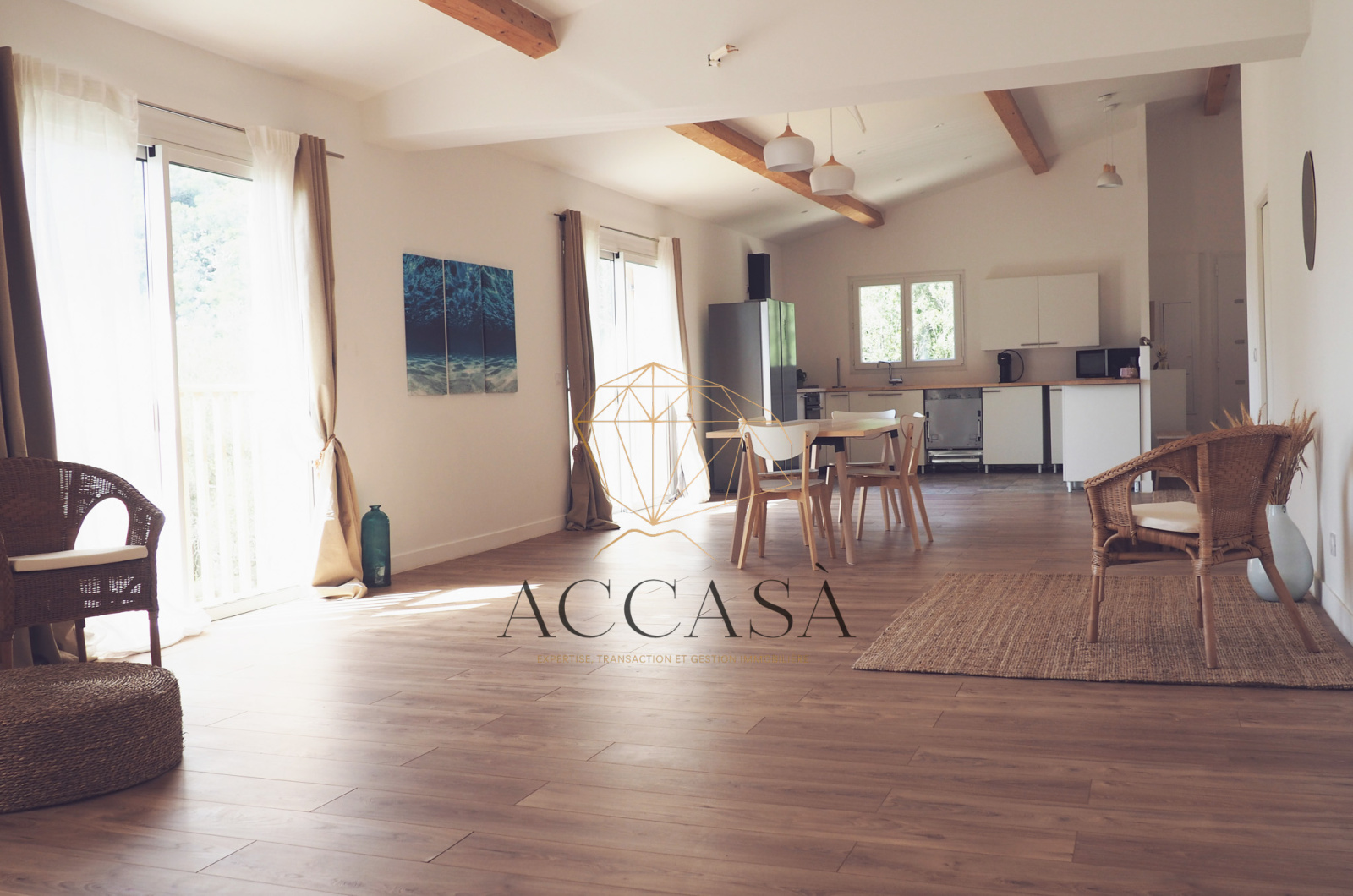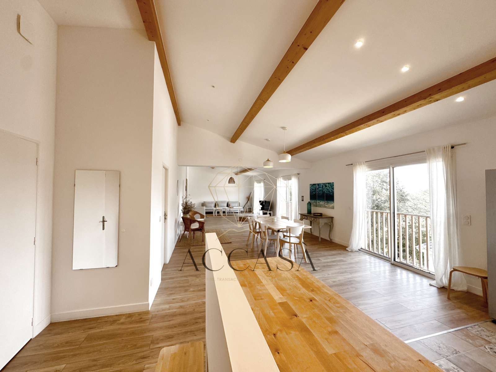 La maison principale développe une surface habitable d’environ 120 m². Elle propose de beaux volumes avec un espace de vie confortable d'environ 65 m², une cuisine ouverte, trois chambres dont une avec salle d'eau privative, une salle de bain et un WC indépendant. Les prestations sont récentes et adaptées à un usage résidentiel de qualité.